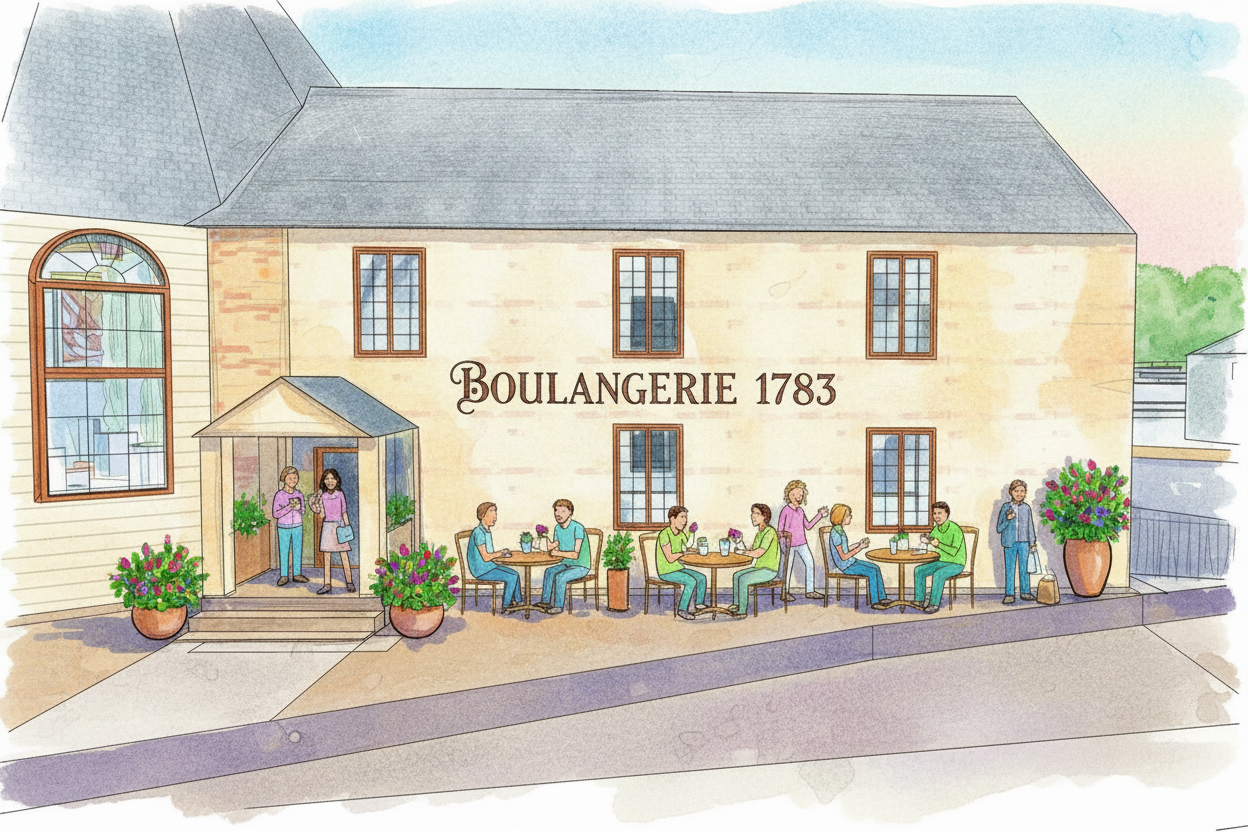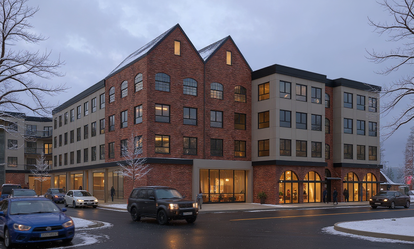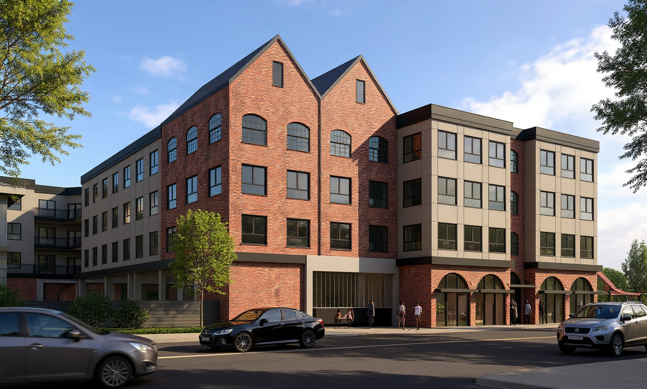 create a beautiful architecture magazine worthy image of this building keep colors textures and existing elements show cars people eating outside and a lively ambiance