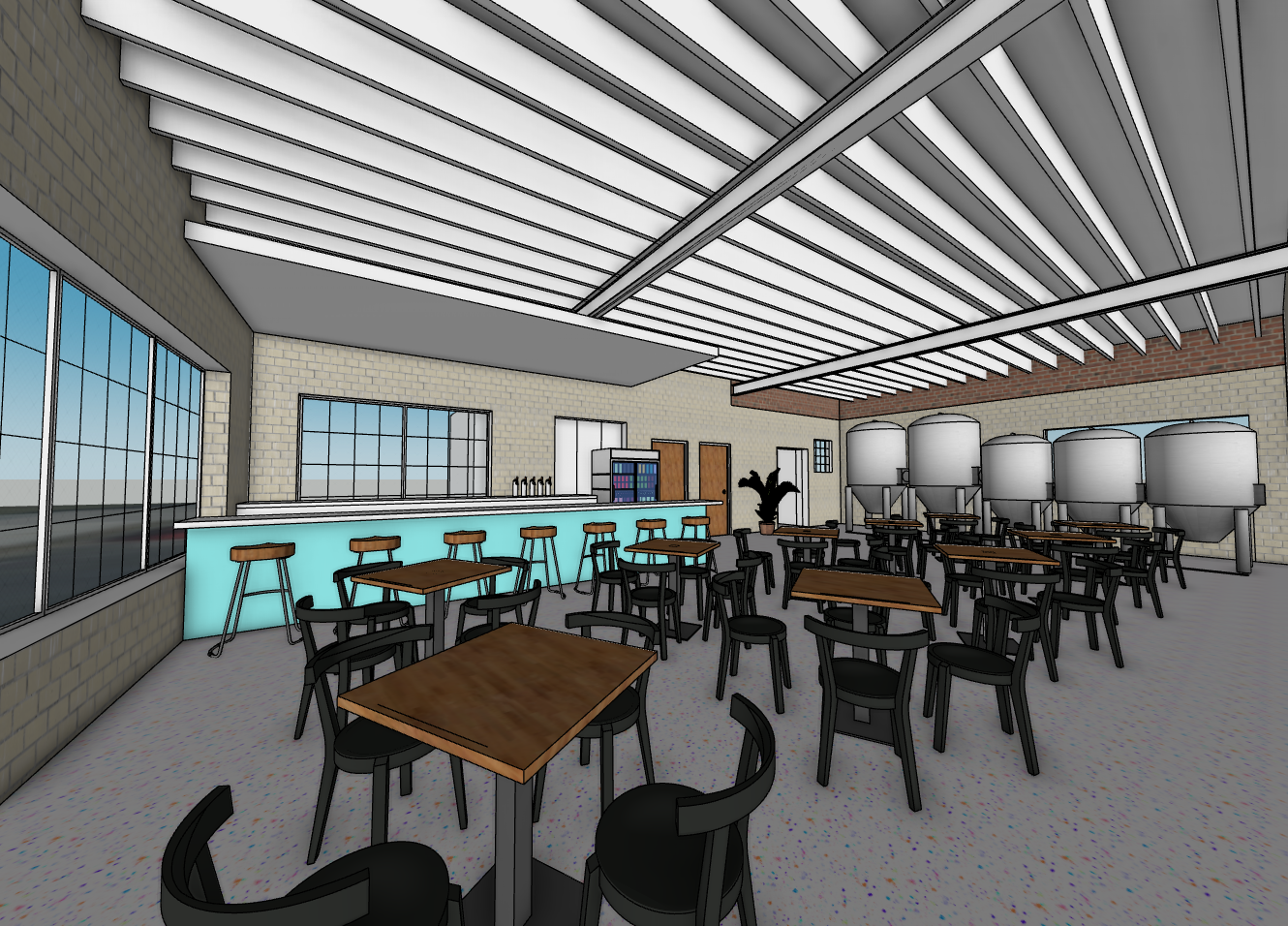 night vibrant taproom brew pub with patrons white painted wood ceiling and industrial lighting