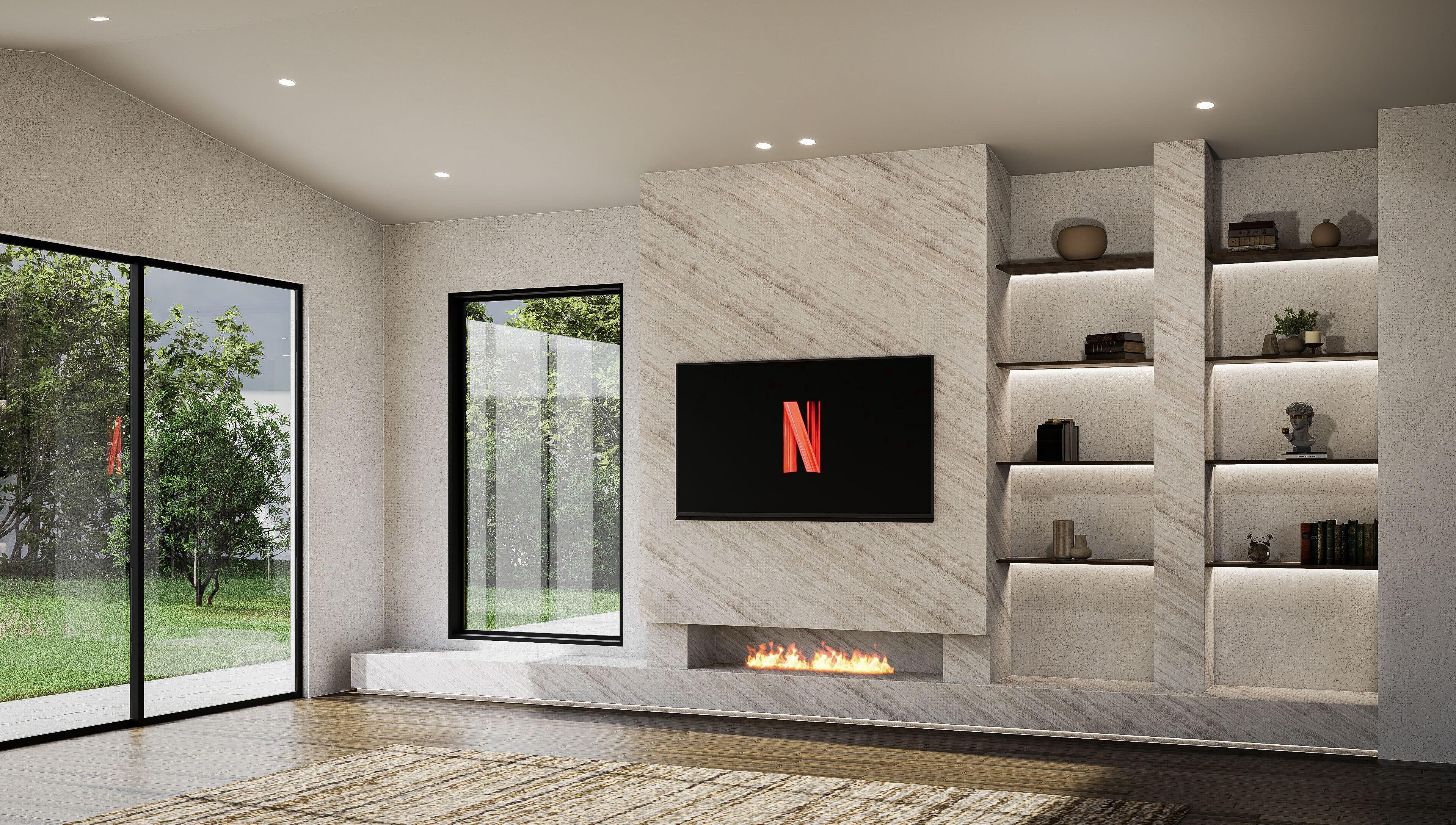 a modern minimalist living room with a built in tv wall and linear fireplace apply jh103 plaster to all walls and ceiling creating a warm neutral tone with a smooth refined finish replace all existing stone surfaces tv feature wall fireplace surround and base with the provided light limestone texture featuring soft beige tones subtle vertical movement and natural porous detailing in a matte finish update the built in shelving so that only the back panels are finished in warm natural wood with a soft elegant grain while keeping the shelves and structure in a clean minimal finish maintain soft integrated led lighting within the shelves keep the overall aesthetic high end warm and contemporary with a calm cohesive material palette