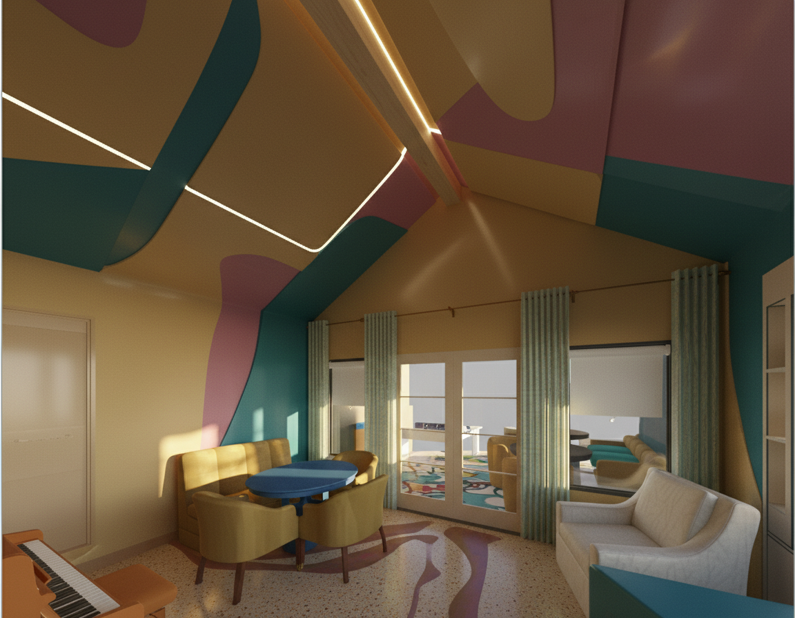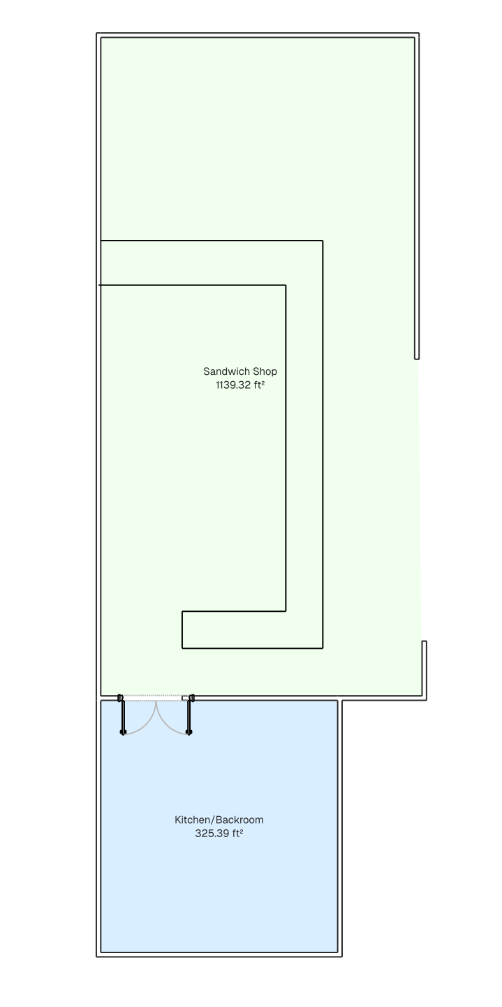 convert this floor plan into a realistic isometric 3d view of a full house show the space from an elevated angle with furniture walls and details visible furnish this sandwich shop to look and feel like a sandwich shop the block in the middle of the plan is meant to be a counter where they make the sandwiches and prepare food as well as cash customers out furnish the kitchen area to be like a kitchen backroom of a sandwich shop follow the tags strictly light white and cream materials for the walls and floors accents of cyan yellow and magenta cube shaped furniture and style use the same furniture as shows on the plan do not change the orientation of the floorplan