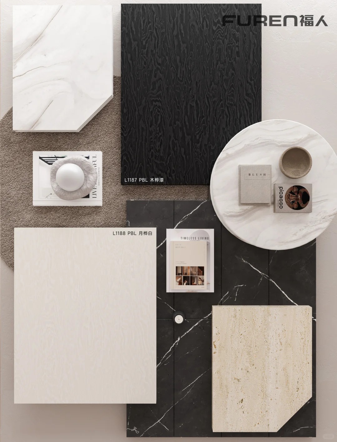exterior shot render a modern kitchen with sleek minimalist design upper and lower cabinets in soft matte white contrasting with a glossy dark charcoal countertop the backsplash features a subtle mosaic of cool blue and grey tiles floor in warm medium oak wood to add coziness incorporate stainless steel appliances for a contemporary feel large rounded window letting in soft natural sunlight creating a cozy inviting atmosphere walls in a gentle light grey to enhance brightness and space