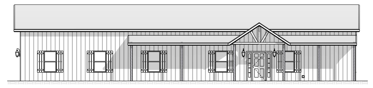 cream color metal vertical siding with a dark green roof natural wood color window trim shutters and door no stone or brick trees in the background sunny day with some clouds