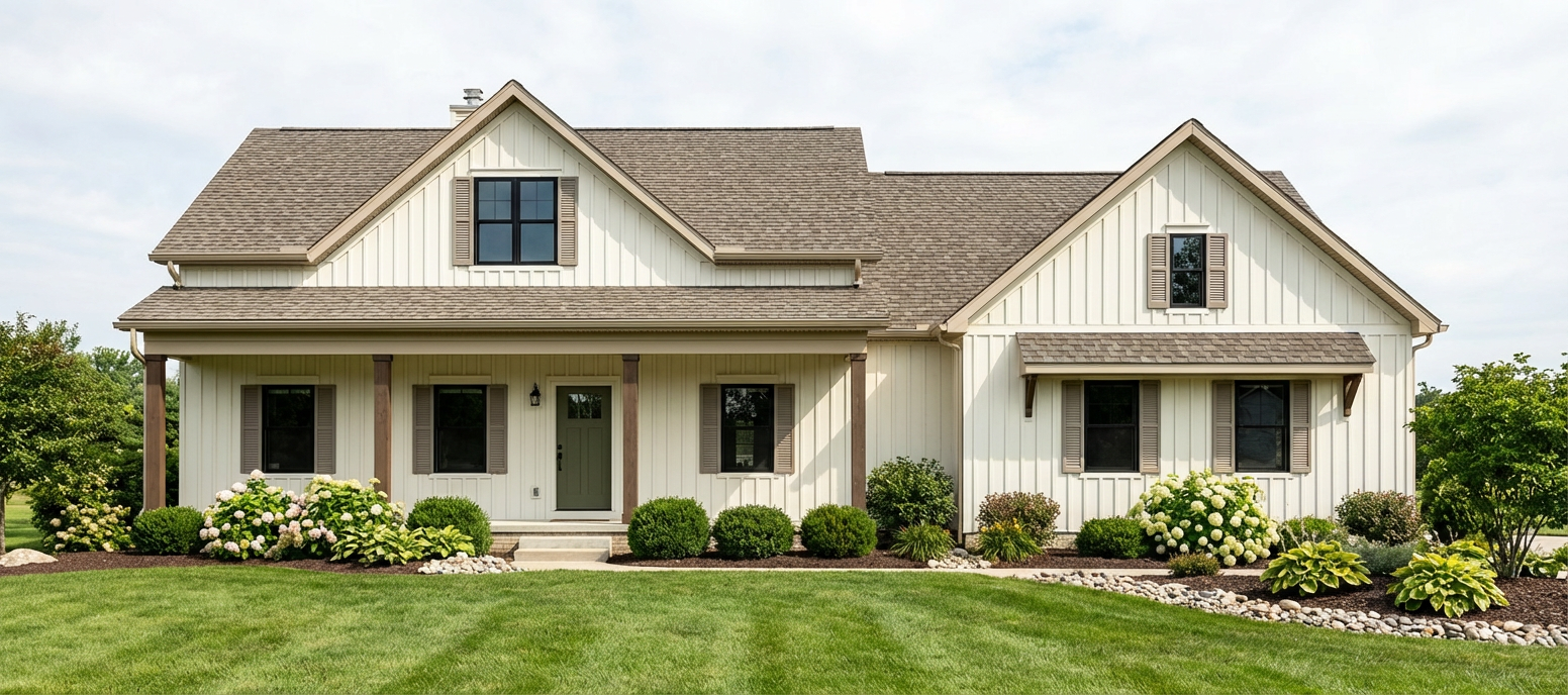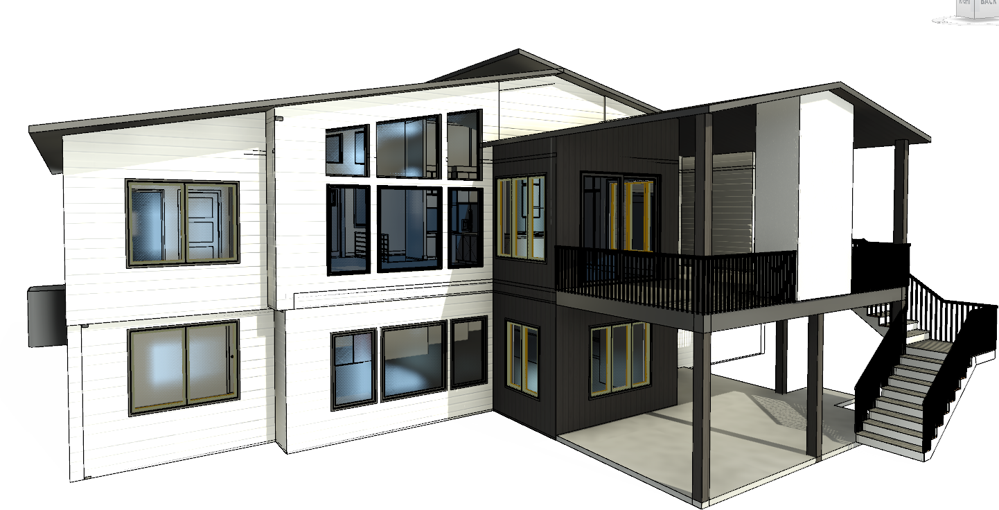 show with black windows and doors a stucco fireplace on the deck add a background furniture on the deck and patio below and minimal modern landscaping