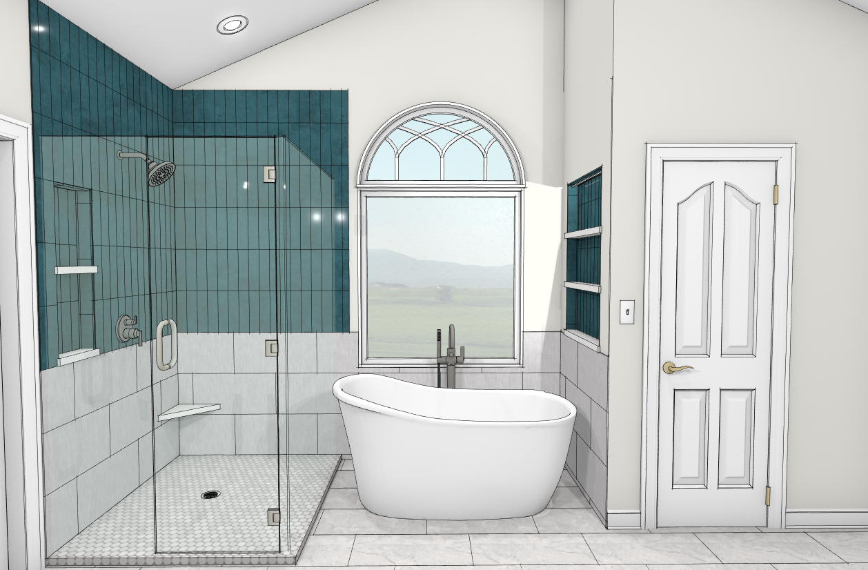 add daylighting from window the bottom window should be frosted add ambient lighting from top of wall niche plumbing fixtures should be ash grey make the walls a soft white