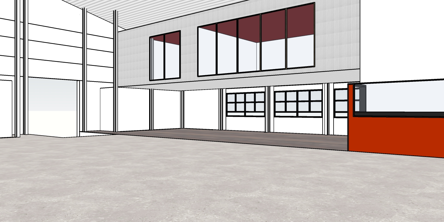 create photorealistic render with natural afternoon lighting add horizontal tube lighting add roller shutter to left opening feature carpet under mezzanine warehouse walls white mezzanine walls cladded