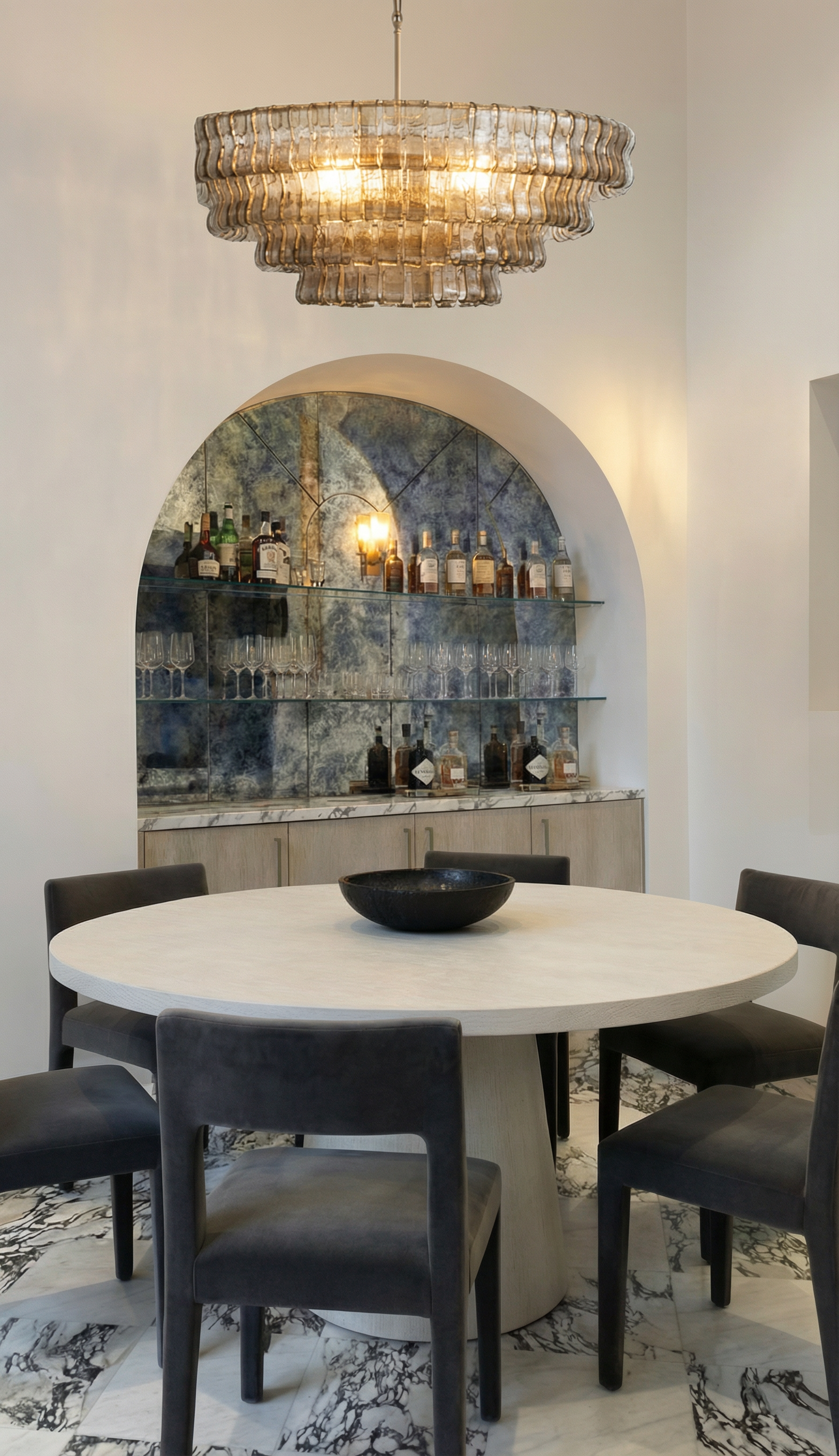 can you create a spacious luxury living room that matches this aesthetic featuring a soft gray velvet sofa and large black arch windows