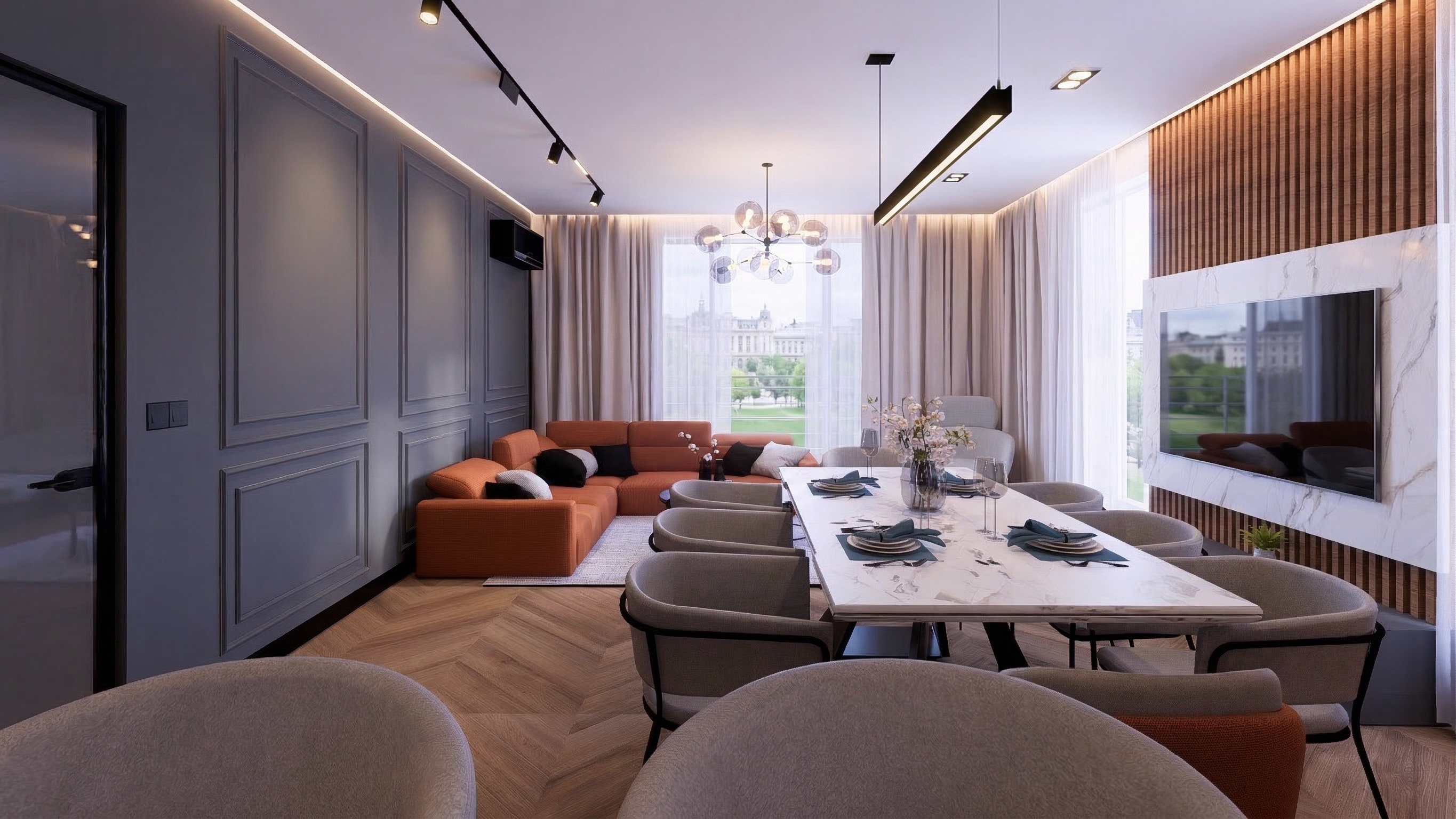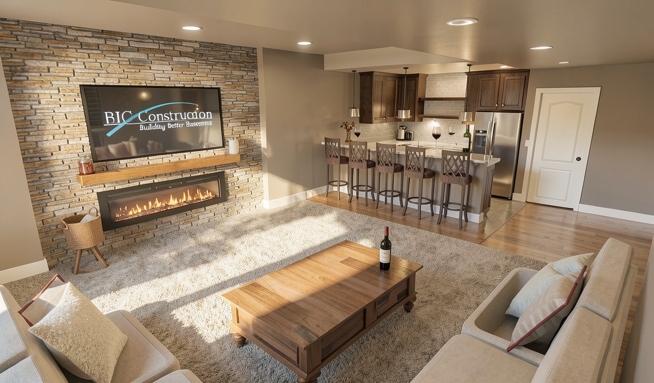 change the black lettering on the tv bic construction building better basements with the light blue swipe through it to white lettering make the carpet low pile pattern and add some light additional furnishings and show two wine glasses and a bottle of wine on the bar top change the stone behind the tv to white brick