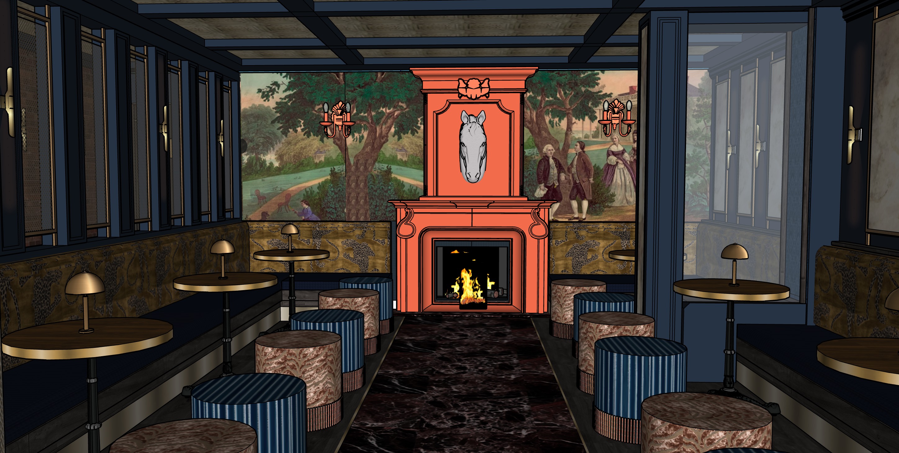 moody speakeasy with semi gloss blue paint and gold tin ceilings red marble semi gloss floors against graytone wood floors brass schluter divider between floors brighten the room slightly table lamp dimly lit brighten the booth fabrics and keep the fabrics the same and stool fabrics velvet soft light spotting the white marble horse sculpture real fireplace glossy coral color fireplace soft glow on coral sconces keep mural on back wall
