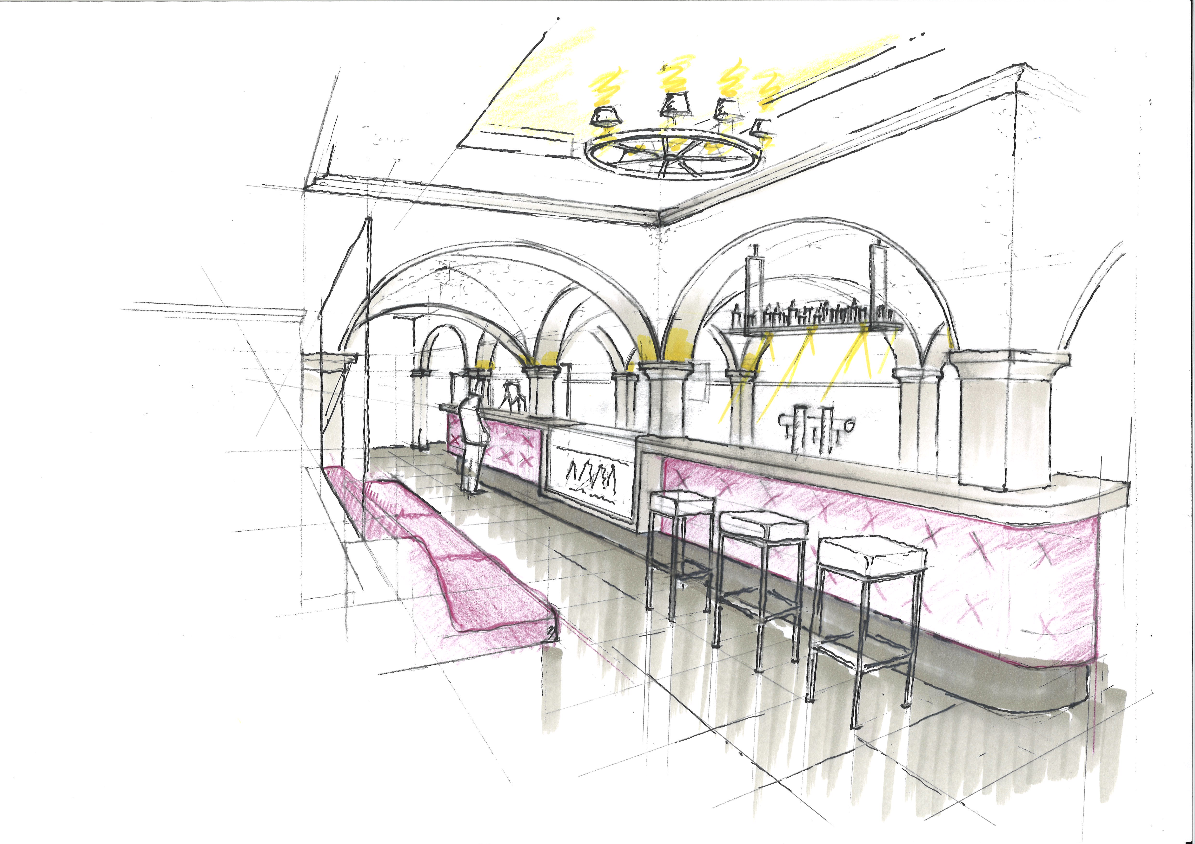 alpine style hotel bar light colors beige simple oak wood evening atmosphere the bar is in the basement vaulted ceiling with slightly rough plaster stone look floor tiles