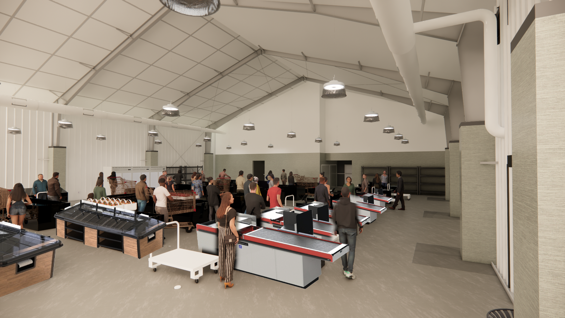 industrial produce market pre engineered metal building with primed gray steel white plastic insulation in the vaulted ceiling vertical white corrugated metal panel on the side walls with light green fiberglass reinforced panels wrapping the columns and up to 10 feet at the end of the space green checklanes with black cash stand surrounds with people paying for their small amounts of produce organized produce well stocked on the merchandising tables and orchard bins muted green stained concrete flooring well lit space galvanized spiral ducts on the right and left of the space