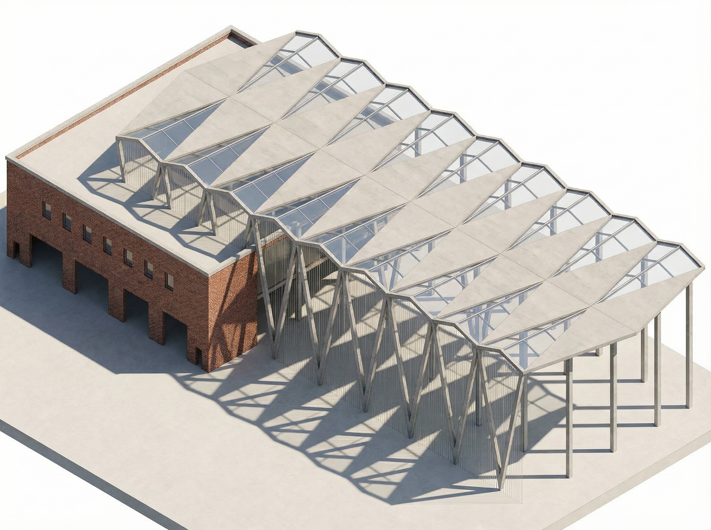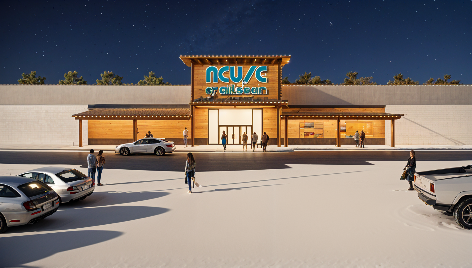 render a modern sports shop in a sunny clear environment the building should have a sleek design with a wooden facade in warm brown tones and a contrasting dark gray roof the shop sign is vibrant with bold blue and green lettering in the foreground place several modern cars in metallic tones like silver and gray with a few people casually walking around dressed in everyday attire the atmosphere is lively and welcoming set under a bright blue sky with scattered white clouds surround the scene with lush green trees in the background to enhance the inviting atmosphere add christmas lights to roof line