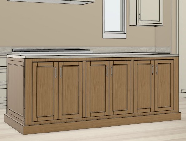 the island is rift white oak the cabinets behind the island are white dove paint the back wall has a decorative tile all of the hardware is brushed brass