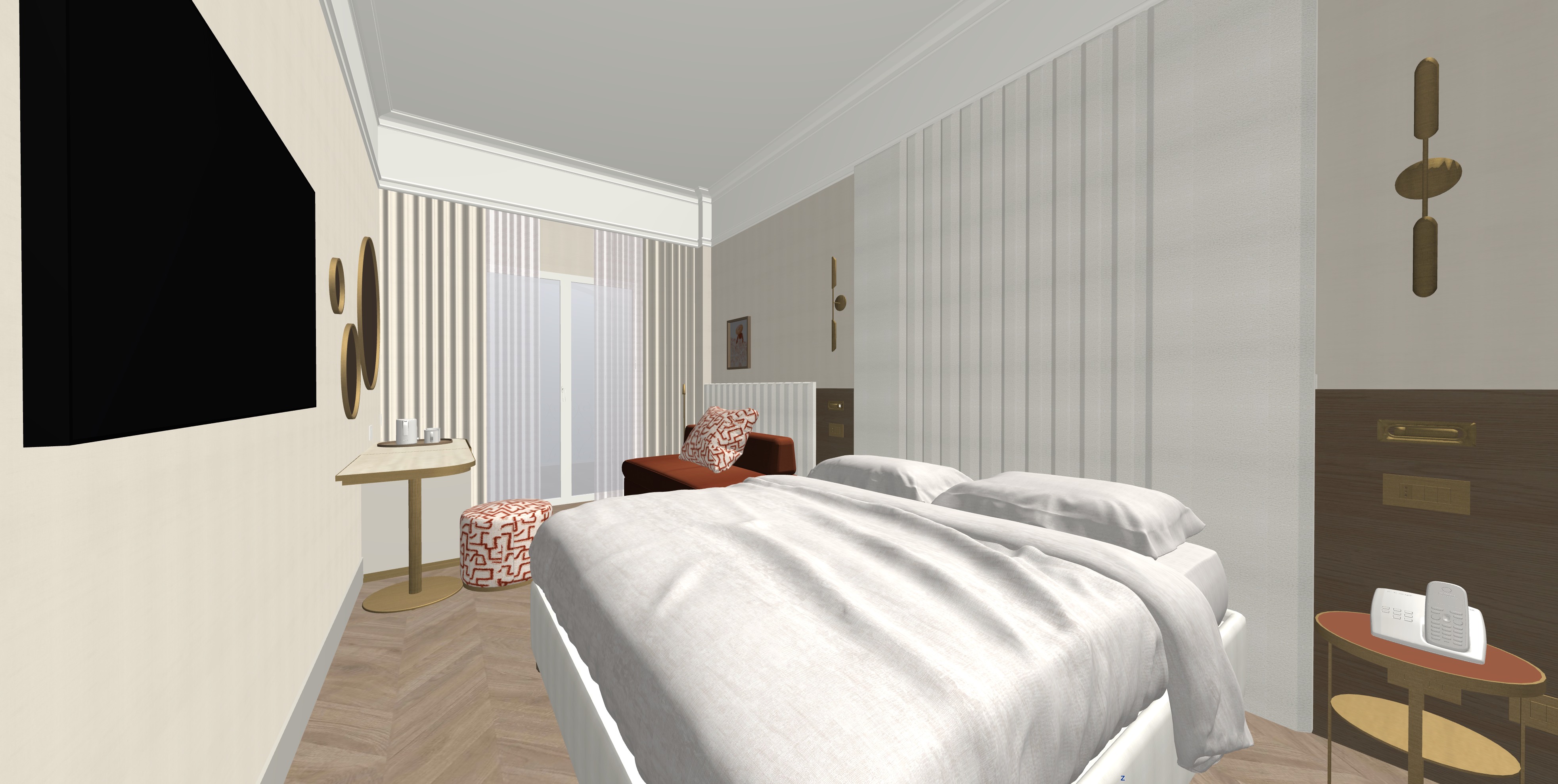 camera di hotel la testata del divano letto ha una retroilluminazione a led solo sulla parte alta gli specchi tondi sulla sinistra hanno una retroilluminazione la veletta della tenda ha una strip led incassata che illumina la tenda la testata del letto non ha delle strip led sui lati le applique di fianco alla testata del letto sono accese il divano letto in tessuto tinta unita colore ruggine la carta da parati in effetto tessuto