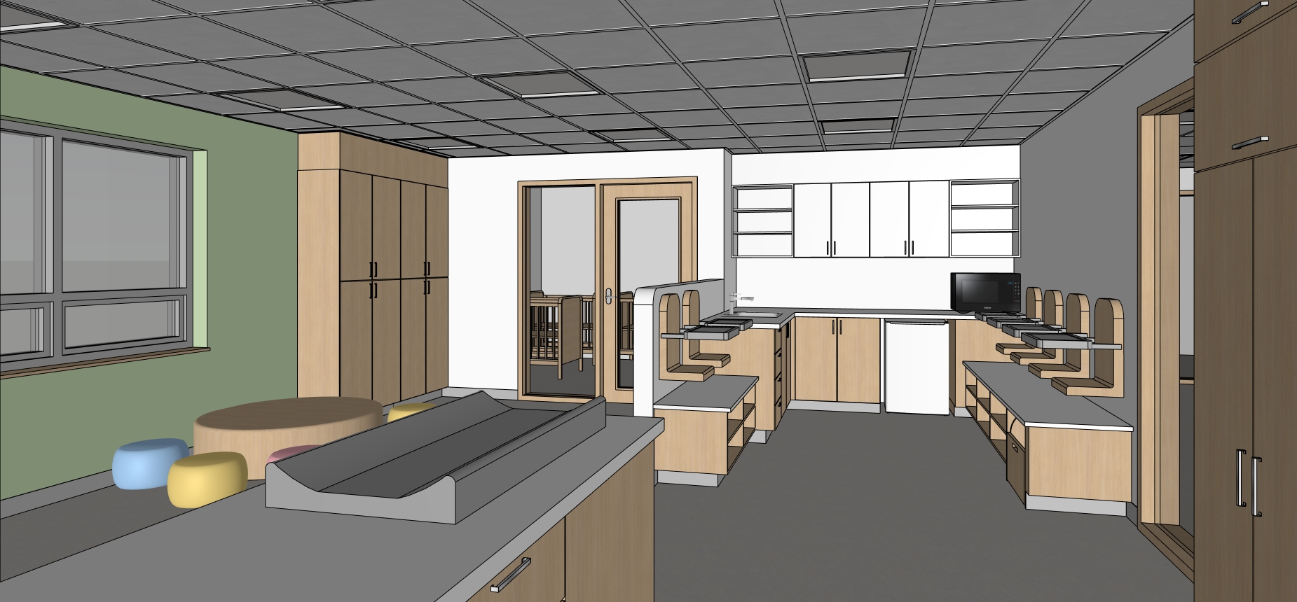 photorealistic architectural interior render of a childcare center cpe based strictly on the provided sketchup image do not add remove or modify any architectural elements furniture openings or layout keep all objects proportions and positions exactly as modeled all existing ceiling light fixtures must be turned on and emit soft realistic illumination combine artificial lighting with natural light if present keeping a balanced and believable exposure preserve the original colors and materials but enhance them with realistic textures accurate material properties and subtle imperfections wood grain fabric softness matte finishes child friendly clean calm and warm atmosphere suitable for a cpe environment realistic global illumination soft shadows correct scale neutral camera perspective no dramatic effects no stylization no artistic interpretation ultra realistic architectural visualization professional quality natural color grading no new furniture no extra decor no change in layout no change in wall positions no change in ceiling design no natural light from the doors glasses interior door all walls and ceiling must remain their orginal colors do not add new light fixture in the furniture do not change cabinets and furniture colors