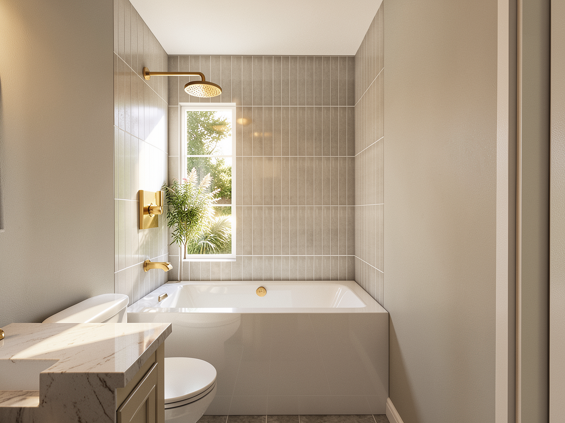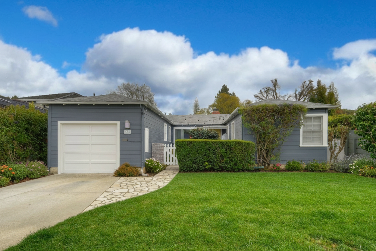 a dark grey blue cabin set on a slight uphill slope pine trees scattered behind it a manicured lawn with native plants a brown shingle roof and a light brown front door and deck the basement deck is concrete a white garage door a soft blue sky with white clouds that softens the scene