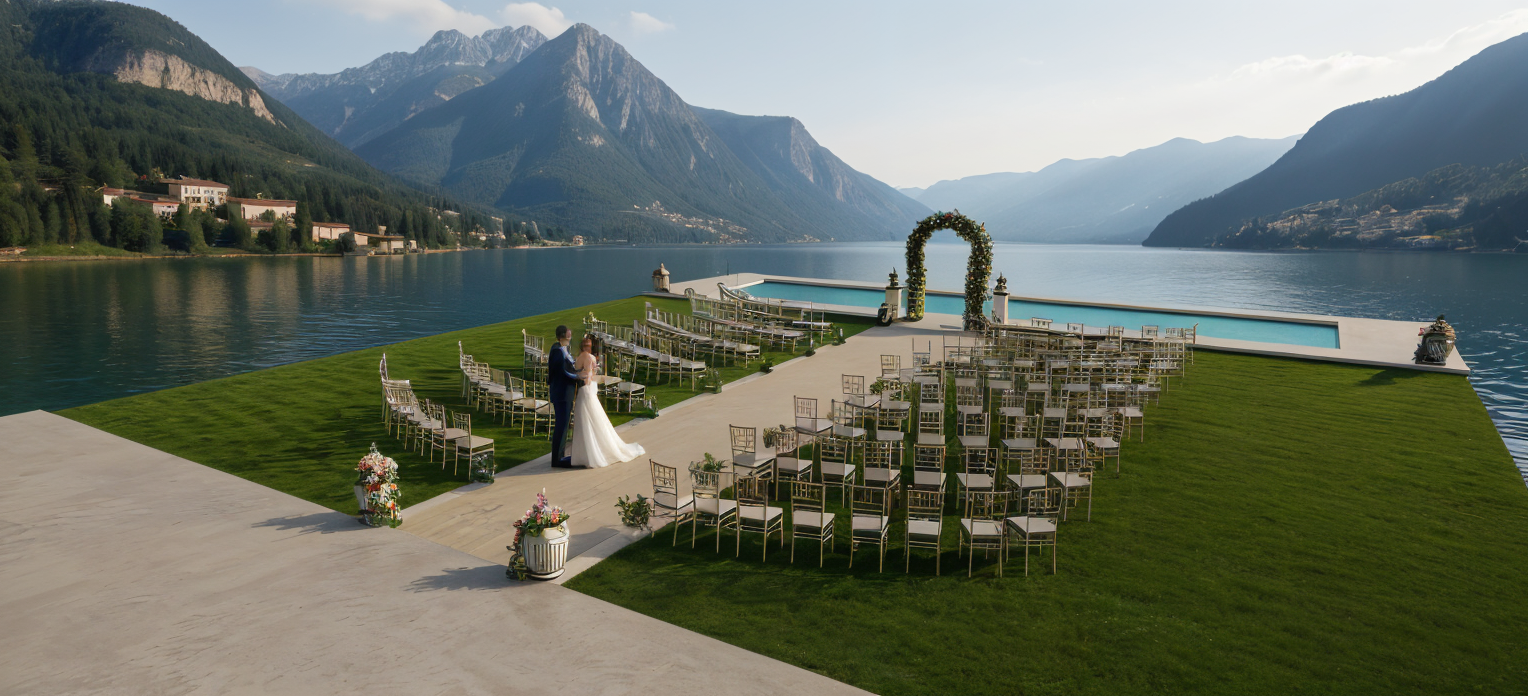 render the outdoor wedding ceremony model on an elevated hilltop setting keep the reference design exactly as it is with original colours and materials add a realistic lake como background the blue lake with surrounding mountains and italian landscape visible in the distance ensure the ceremony appears naturally placed on the hill overlooking the lake with depth and realistic perspective