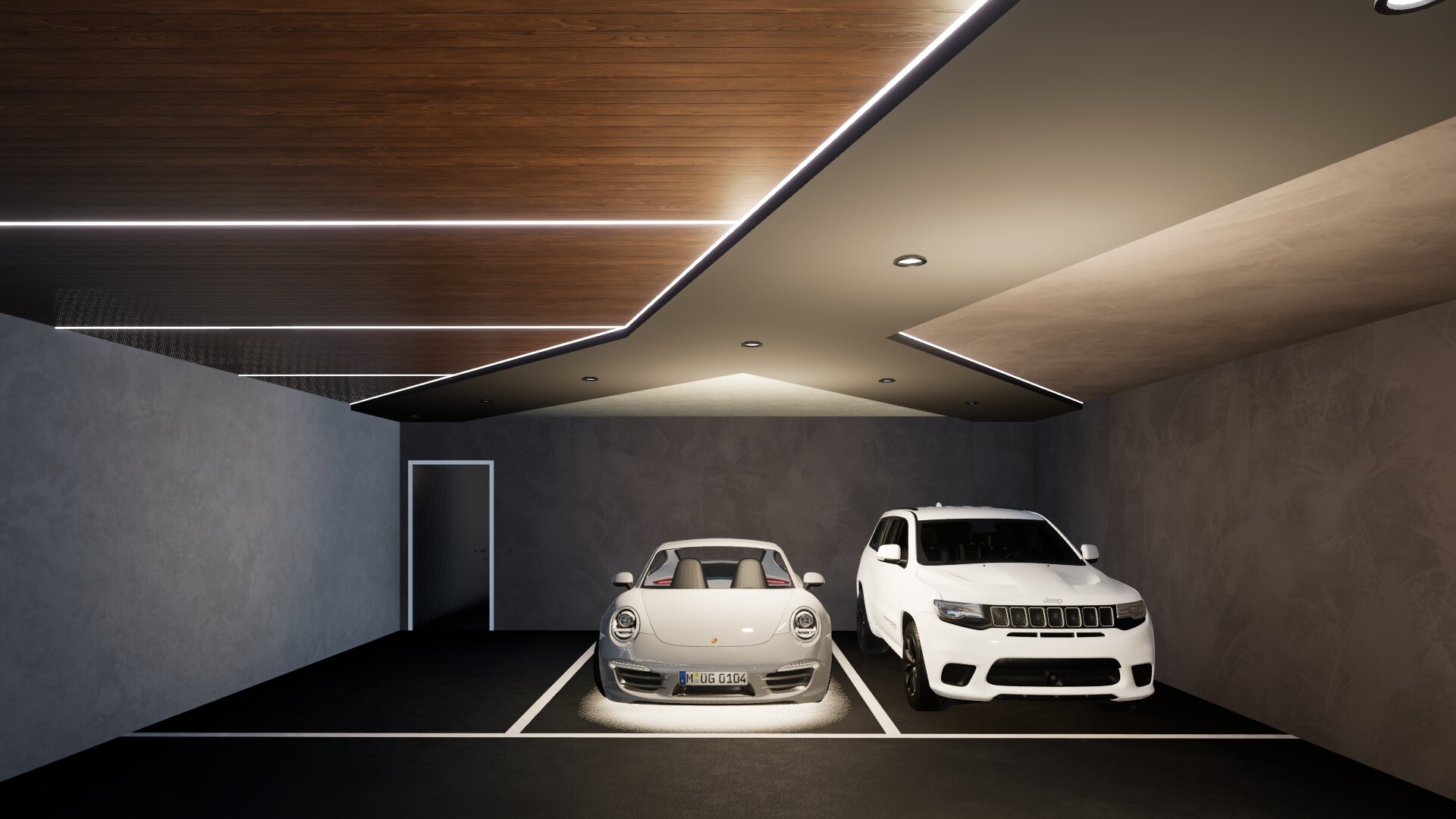 a modern luxurious garage interior with sleek design elements featuring two parked cars a silver convertible and a white suv the ceiling is adorned with rich wooden panels and elegant recessed lighting creating a warm and sophisticated atmosphere the walls have a textured gray finish adding depth and contrast to the space the floor is a smooth dark asphalt tone complementing the overall aesthetic the lighting is soft and ambient highlighting the architectural details and emphasizing a contemporary ambiance