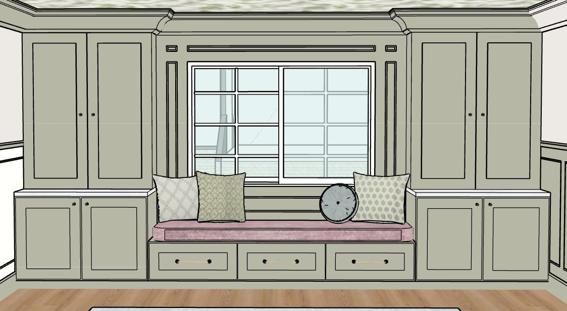 a beautifully rendered room with elegant cabinetry and a cozy window seat the cabinets are painted a soft sage green providing a calming and classic feel the window seat features a blush pink cushion adding a subtle touch of color the throw pillows are a mix of patterns and textures in cream soft green and muted blue the window is large allowing natural light to flood the space creating a warm and inviting atmosphere the floor is a light oak wood enhancing the natural and serene ambiance make cabinetry lighter green