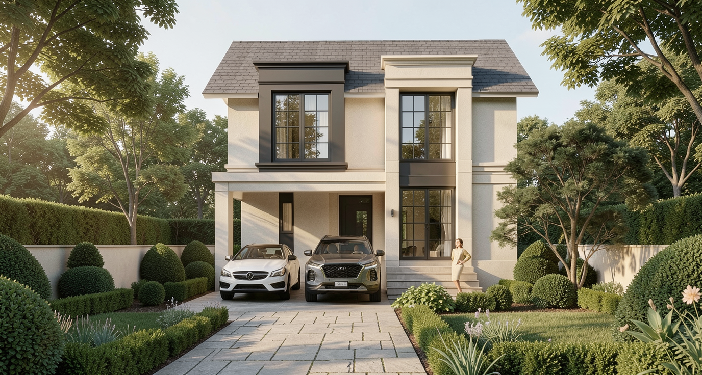 create a photorealistic picture of a residential building with brick walls and ceramic rooftiles and solarpanels all standing in a nice and friendly garden with a rural neighbourhood and some trees around the sky should be sunny and friendly with some clouds and birds keep the colors of the building make it like an awsome commercial advertisment for a residential building the villa is surrounded by a lot of trees bushes and flowers in the garden keep the shape and the size and the materials of the building like it is