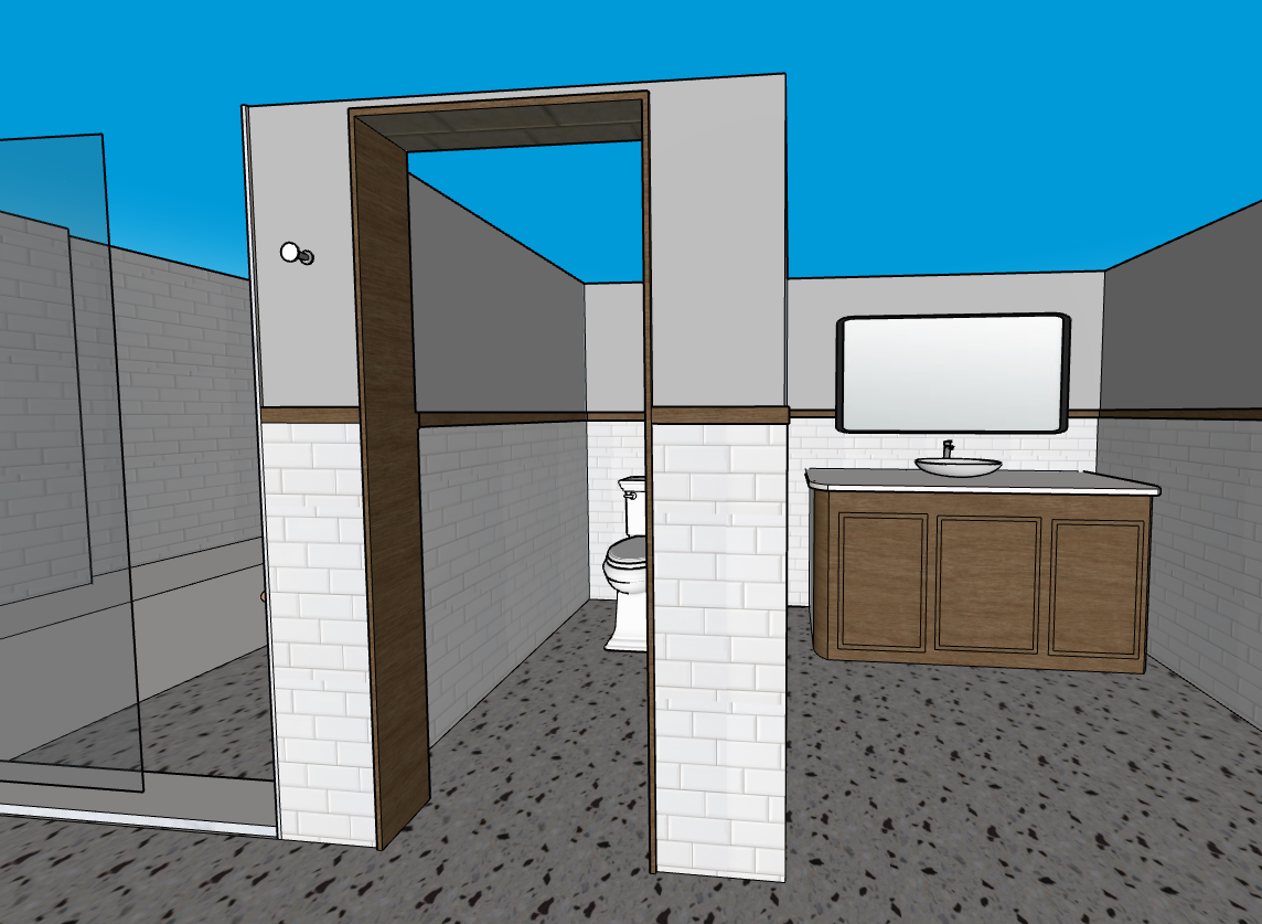 modern bathroom white subway tile wainscot with walnut wood trim modern vanity with 1 undermount sink and modern faucet with a mirror hanging above toilet room with modern door large shower with white subway tile