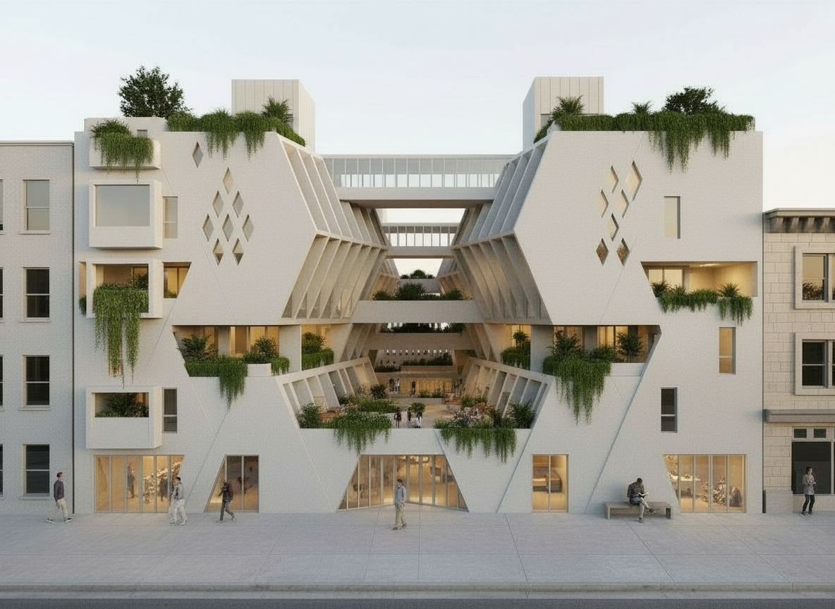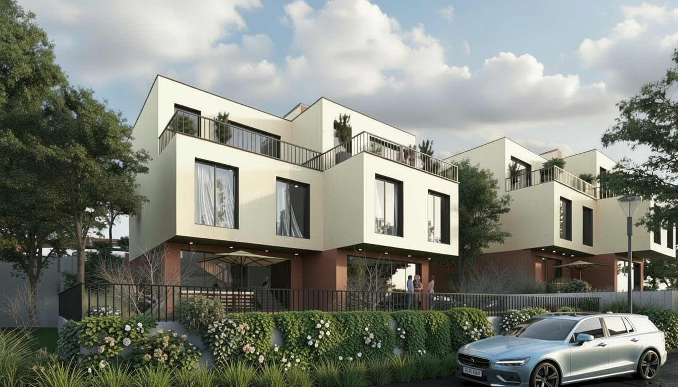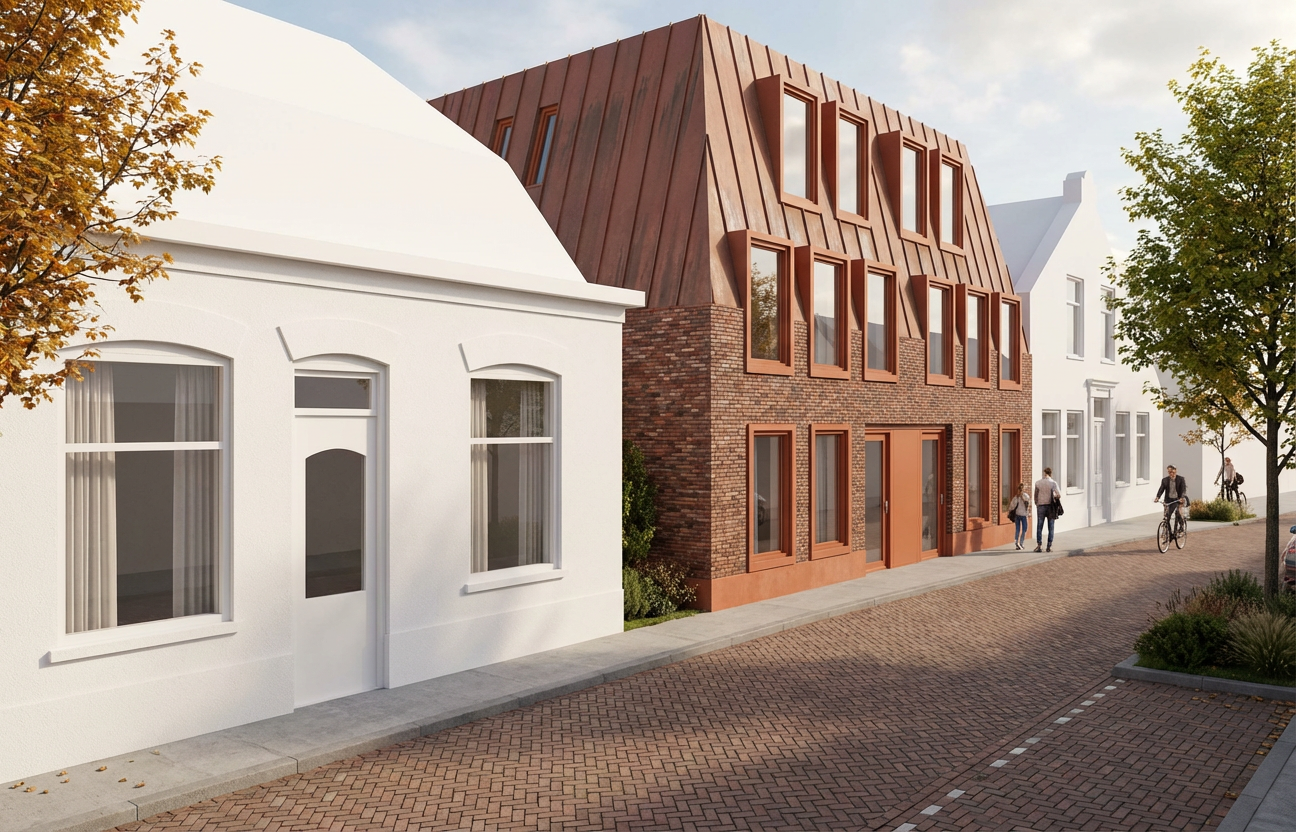 create a warm and inviting residential courtyard scene inspired by contemporary dutch architecture the main buildings should feature fa ades made of red brown mottled brick and window frames in an orange red brown tone the roof detailing must consist of vertical panels in a red brown color with a matte weathered texture adjacent buildings may appear more abstract while still maintaining a sense of neighborhood cohesion and should be entirely bright white with glass to create contrast between the sidewalk and the bottom edge of the window frames include a trasraam plinth made of pigmented concrete in the same color as the window frames depict an autumn like day in the netherlands with soft slightly diffused daylight and gentle warm tones on the right side of the scene include a green tree with autumn foliage in front of the buildings on the left side of the street add an additional tree include a pedestrian sidewalk and use traditional dutch style brick pavers for the street surface add subtle landscaping and a few people walking or cycling to create a calm community oriented atmosphere