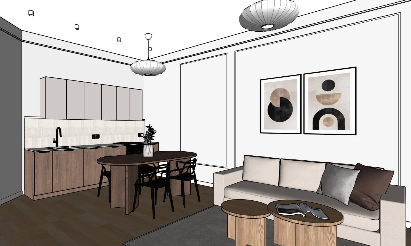 open plan kitchen and living room white smooth walls with decorative wall molding panel frames white smooth ceiling with subtle rounded coving light oak hardwood floor left side single wall one wall kitchen with walnut wood lower cabinets matte gray greige upper cabinets beige cream textured tile backsplash black countertop black sink with black faucet built in black oven and cooktop small plant in vase on countertop dark walnut oval dining table connected to kitchen counter as peninsula four black wishbone style chairs center two white paper lantern pendant lamps hanging at different heights right side beige cream upholstered sofa with gray and brown cushions two round oak nesting coffee tables with open magazine dark gray area rug two abstract geometric art prints in black frames on the wall above sofa circles and arches in black beige and brown tones warm natural daylight scandinavian minimalist style photorealistic interior photography