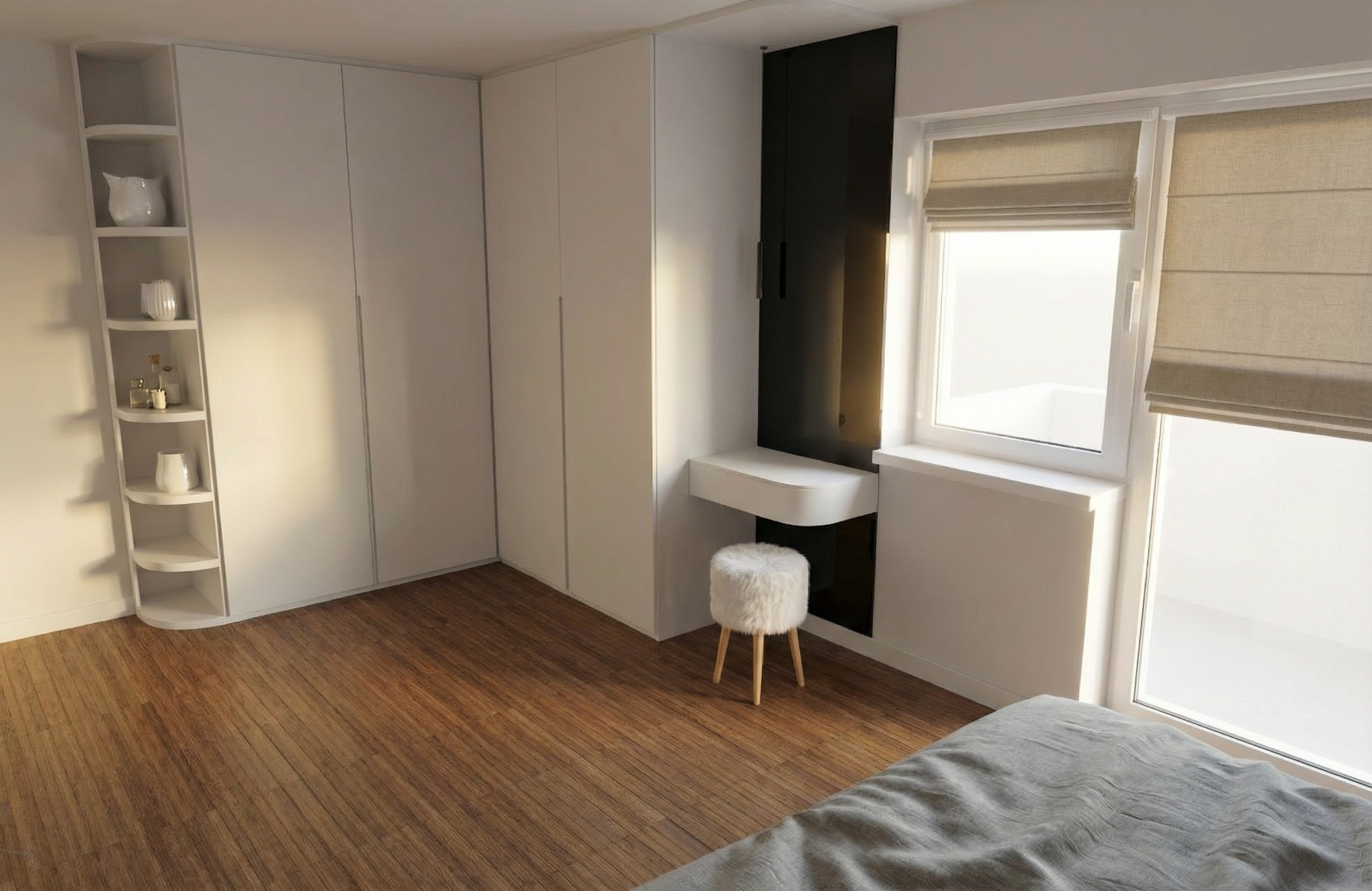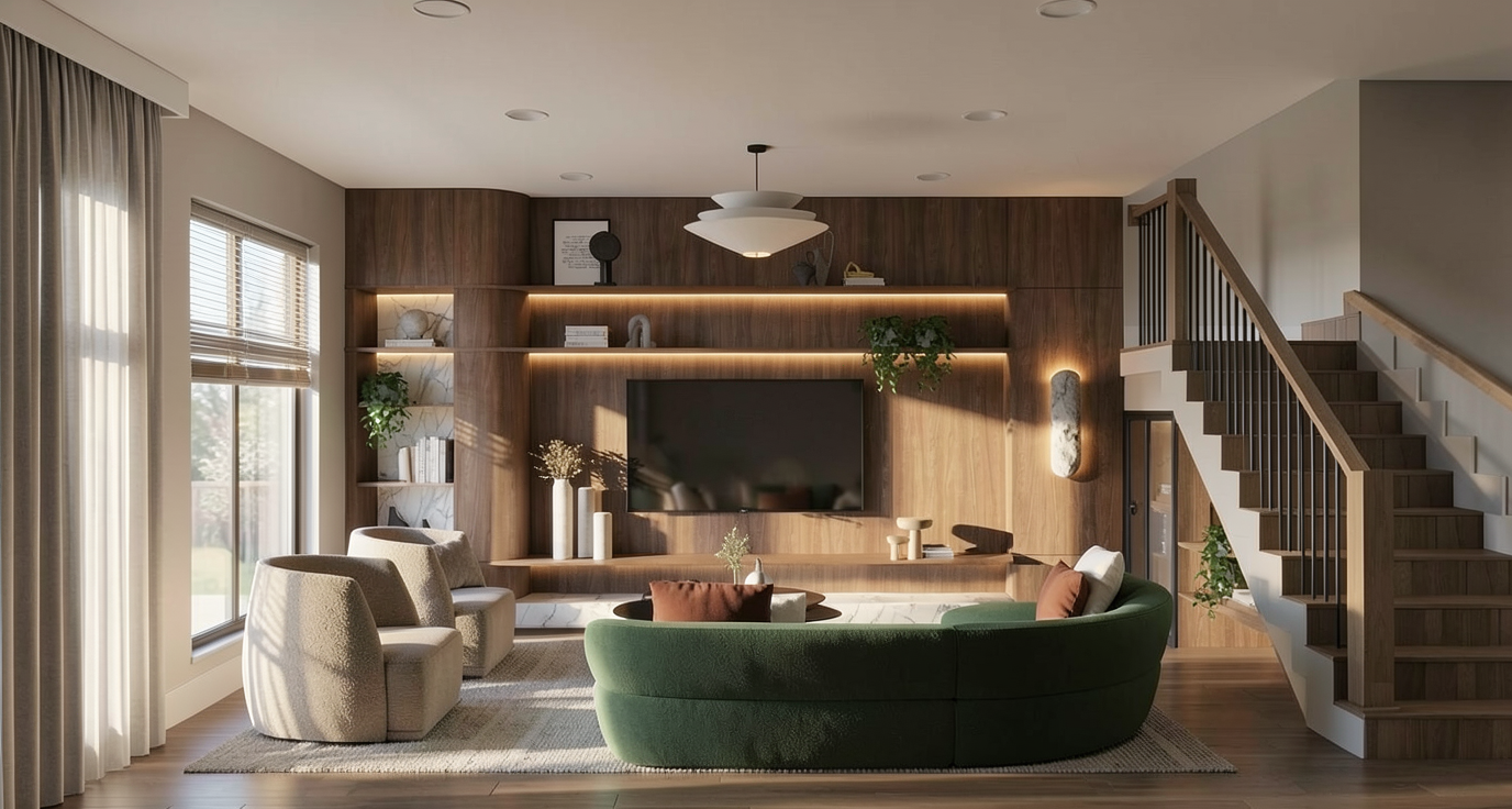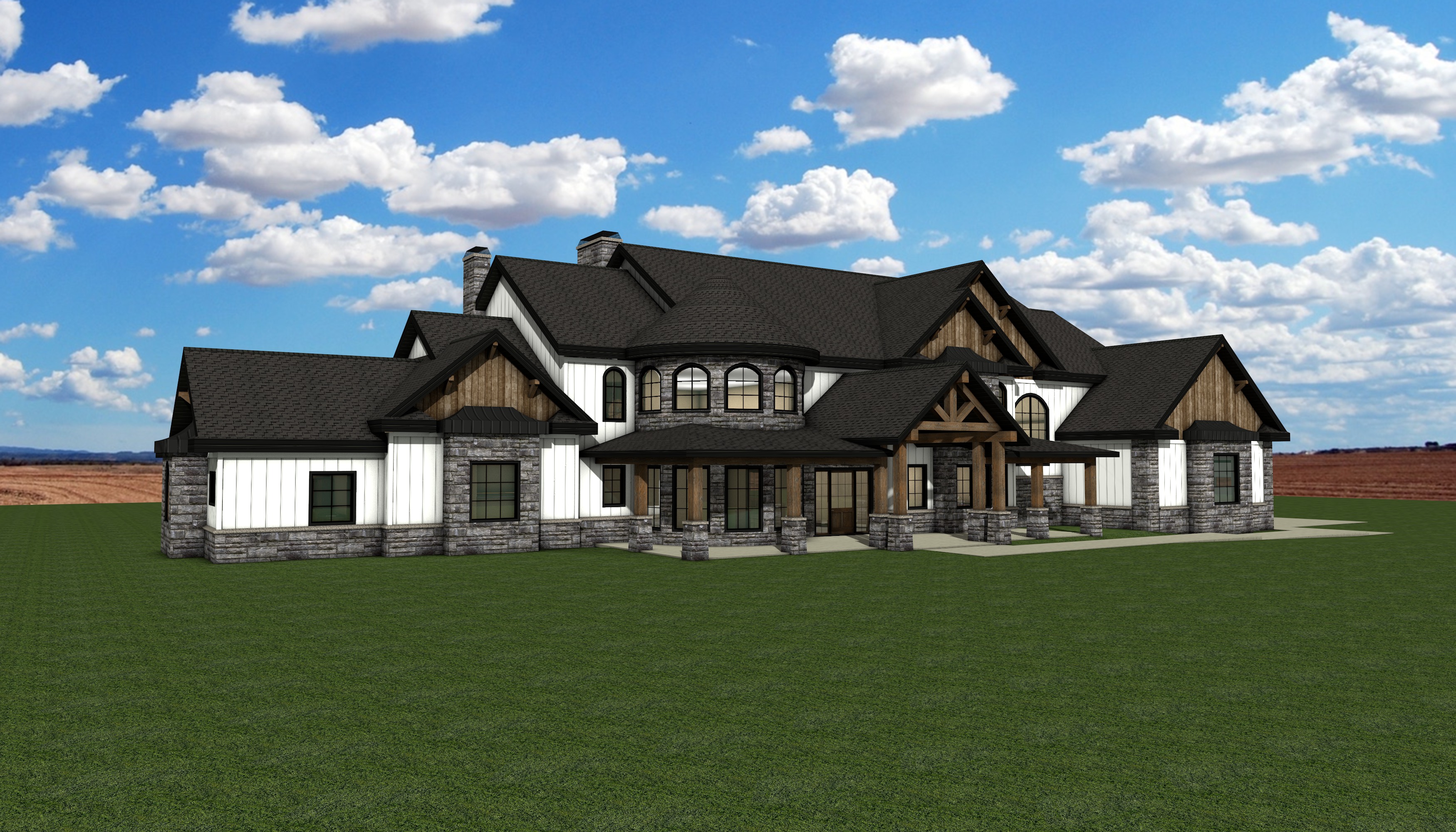 a modern house retain the exact structure colors and window arrangement rooflines siding roof material foundation height railings wood stain colors and proportions exactly as shown in the reference image integrate into the terrain there is some sagebrush in the distance with sand hills and dunes behind the sagebrush there are some smaller mountains behind the sand hills mostly in the distance of the image add cooler diffused afternoon sunlight subtle dappled highlights across the siding and grass create ultra photo realistic lighting crisp shadows detailed textures in the siding and glass reflections and an overcast sky show only a few lights visible inside render in hyper realistic architectural visualization quality 8k resolution add a driveway tying into the concrete garage door apron make it the fall season add realistic landscaping around the home have an old farm fence in the background