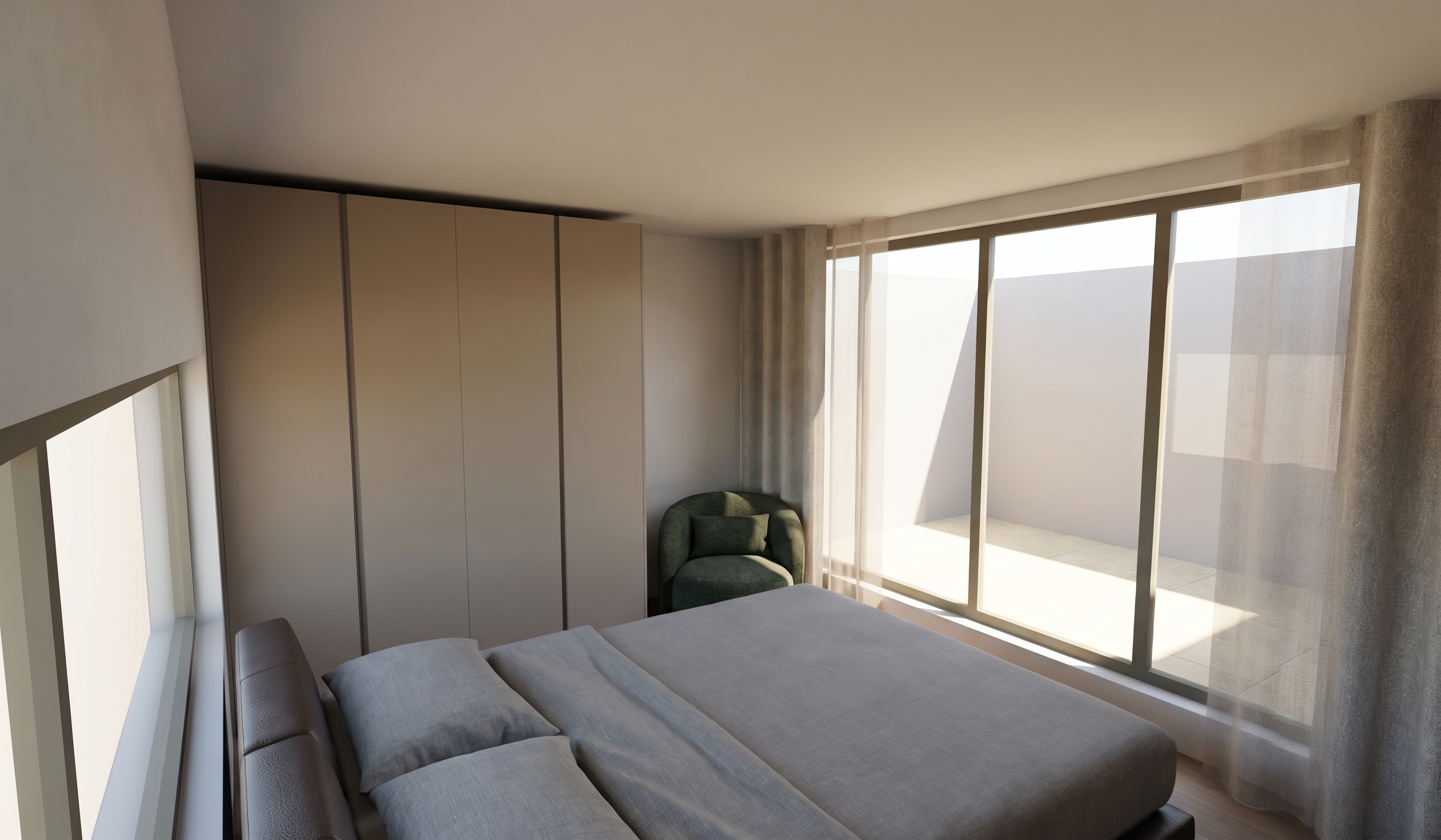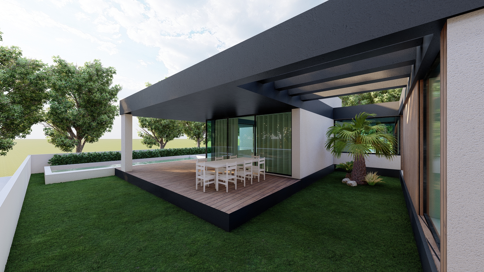 cena exterior hiper realista com ilumina o natural do sol de fim de tarde brilhando na janela relva verde e macia