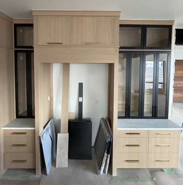 do not change the cabinets in any way preserve the exact cabinet colors materials finishes dimensions door and drawer styles hardware spacing alignment and all geometry exactly as shown do not alter the countertop shape backsplash appliances flooring lighting fixtures or wall structure only remove the construction materials clutter and mess from the scene clean the room and make it look finished and staged add a few simple tasteful home accessories appropriate for the style of the space but do not add or remove any furniture windows or architectural elements maintain the original lighting direction and realism enhance clarity and polish the photo while keeping the cabinetry and room design completely unchanged do not alter the lighting to keep the cabinet colors as they are in the image add a subzero built in fridge in the opening with stainless doors keep the perspective and cabinet layout as is