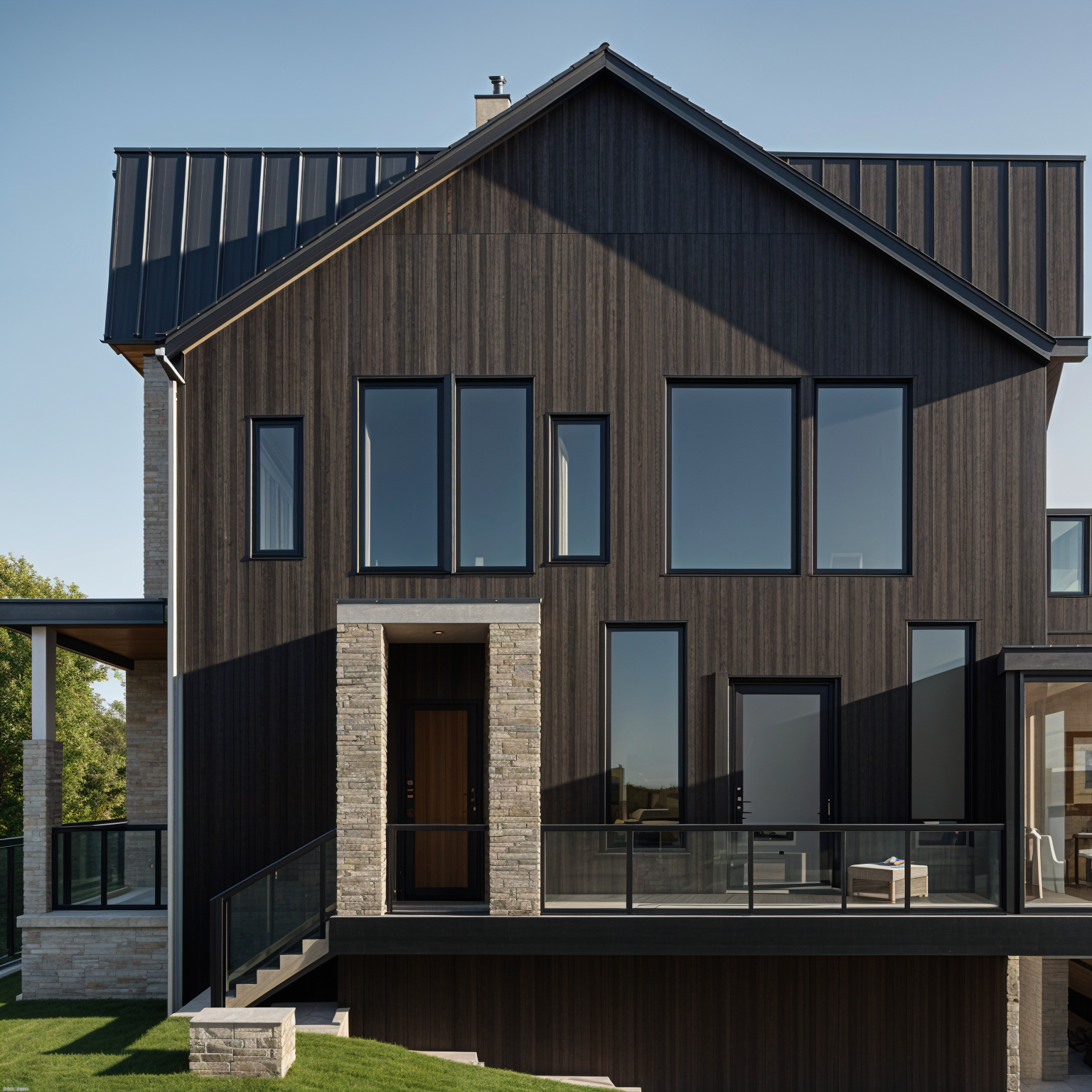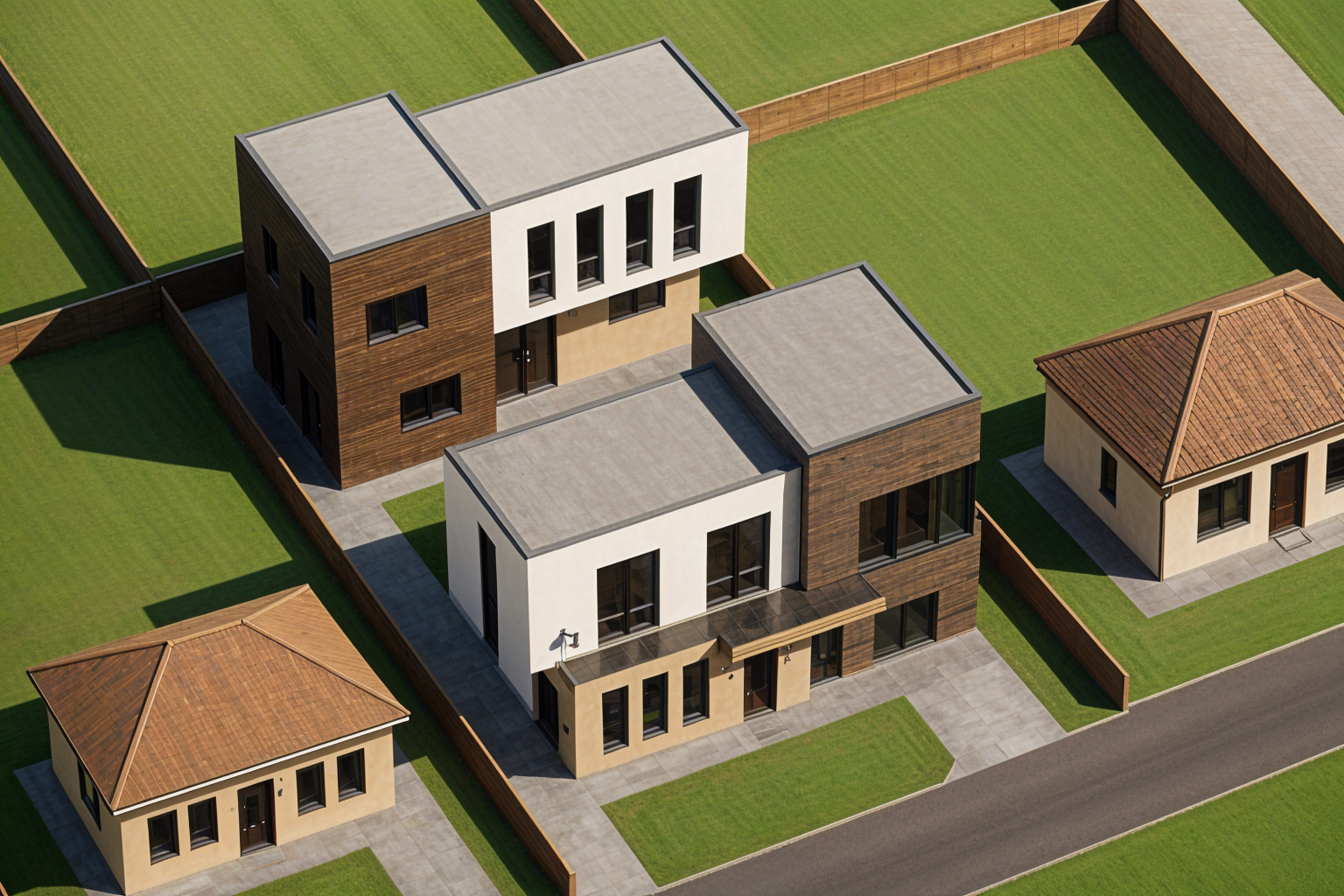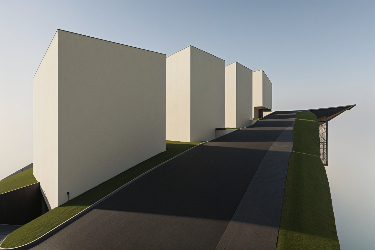 four stepped mdoern townhouses on a sloping site the driveway is a boulevaed with a green belt either side the houses are modern forms with considered openings for glazing white stucco plaster on a brick plinth and chacroal joinery glazing is opeing to the drive use vetical louvres urban houses in the background soft cloud in the sky high afternon sun