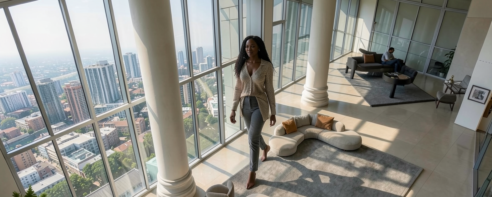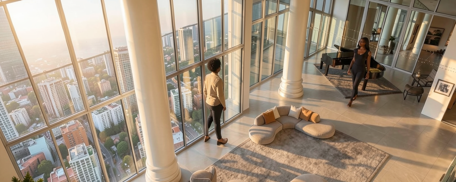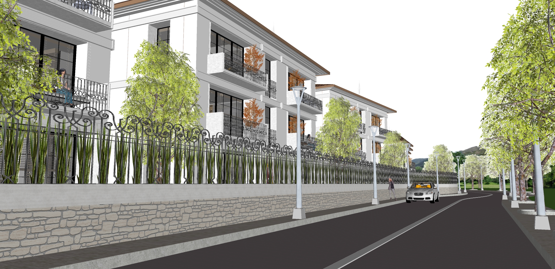 create a picturesque landscape featuring a modern to neoclassical residential complex the buildings showcase white walls with elegant black accents and warm dark brown terracotta roofs surround the area with lush green grass and vibrant trees using varying shades of green to add depth the road is a smooth dark gray asphalt lined with trees whose trunks are a natural brown and foliage a mix of light and dark greens the horizon reveals rolling hills painted in earthy brown and green add green alongside the fence perimeter some kids playing in the garden sky blue with some white clouds add some furniture inside the villas and apartments please take care to show the details of the glasses of the windows they have a nice dark filament it is night time street lights are on lights on are inside apartments and villas also
