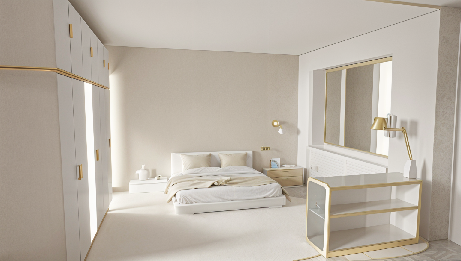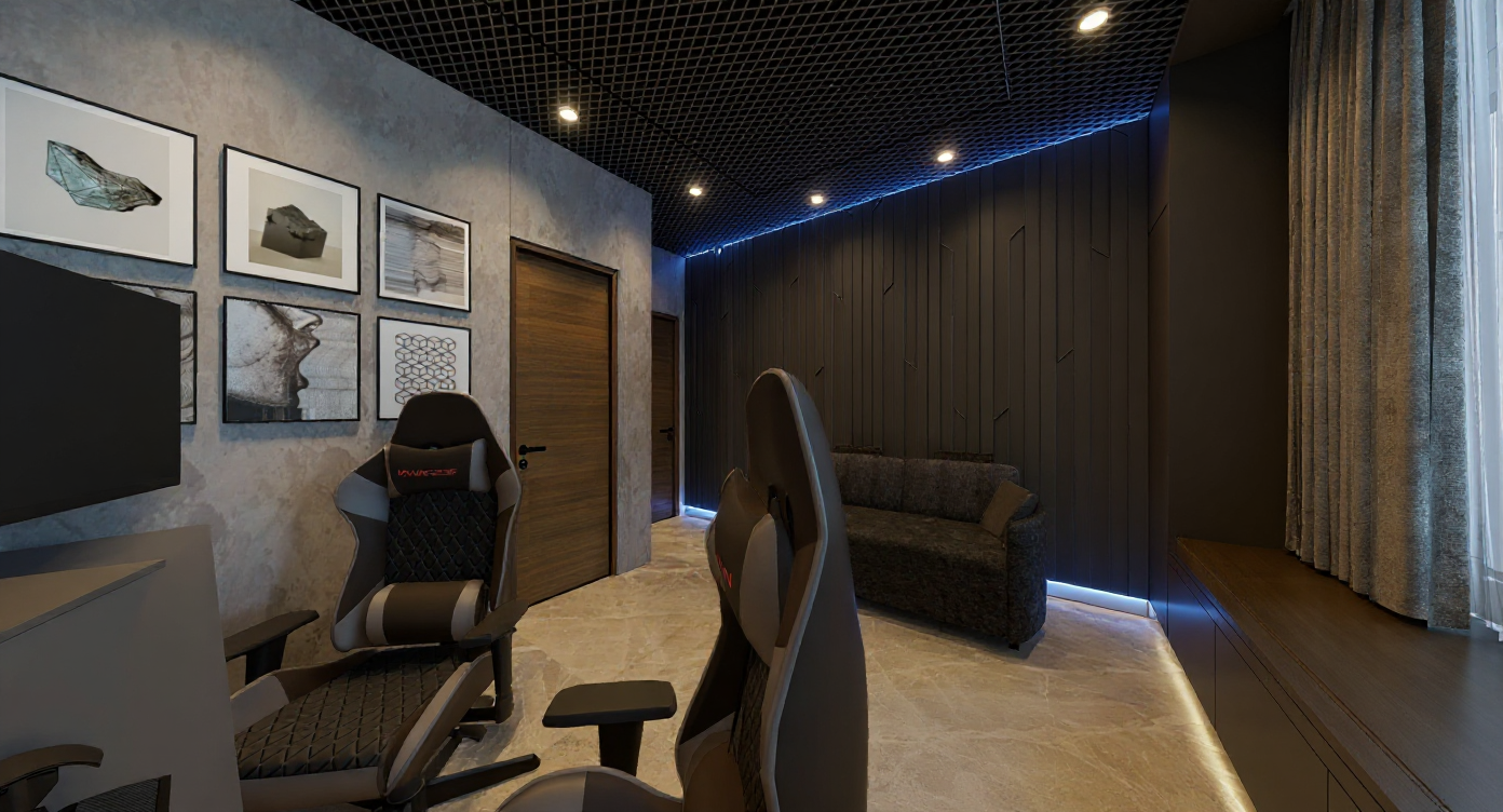 add planting at the back add soft natural light coming from the rear window and the skylight add artificial lights ceiling spotlights at the front room and soft undershelf leds to the shelving unit on the right