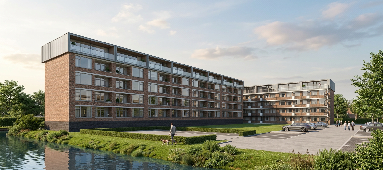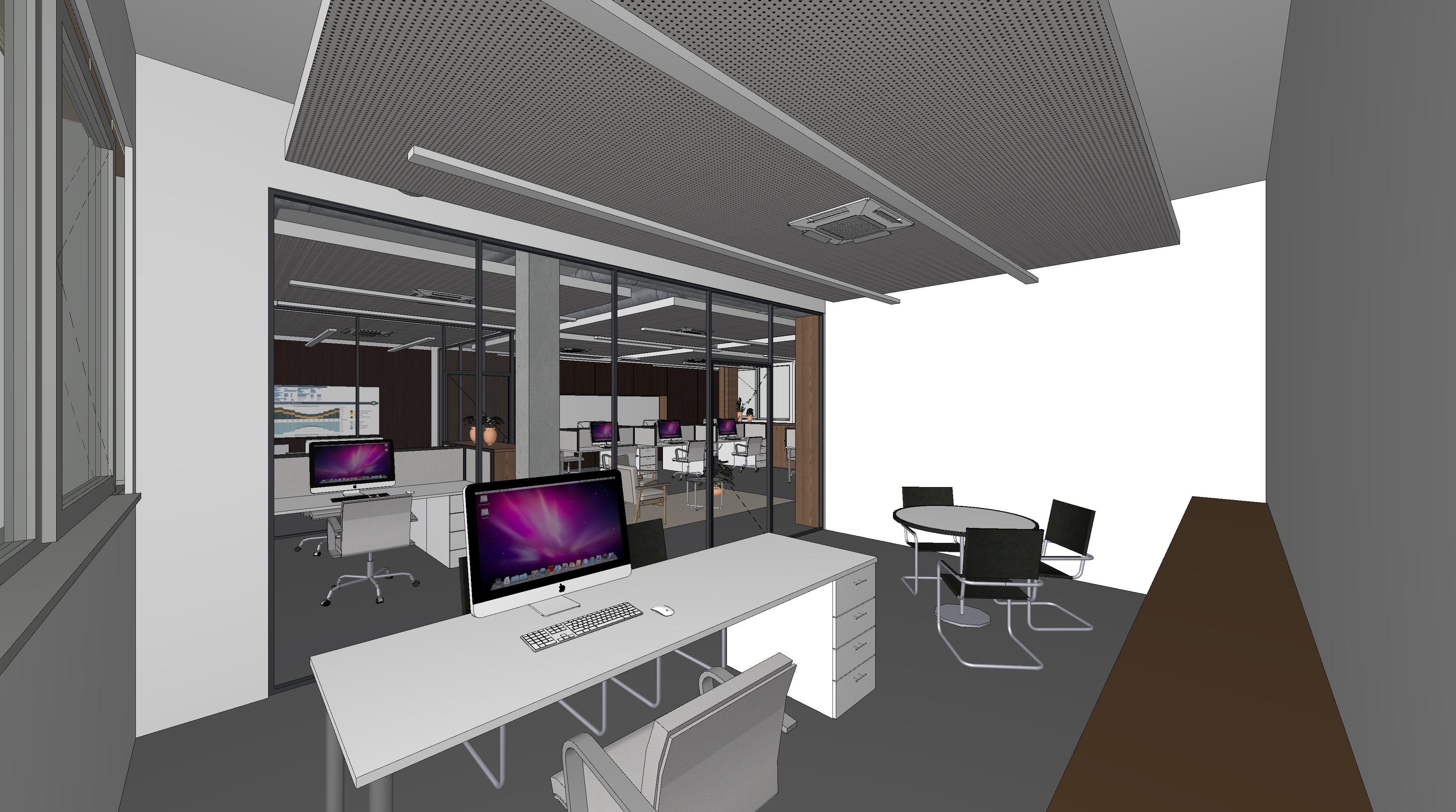 professional photorealistic office interior rendering modern open space workplace with dark walnut wood furniture and light wood accents perforated white plasterboard suspended ceiling suspended linear led lights with visible hanging cables exposed hvac ducts industrial style glass walled meeting rooms imac workstations cozy waiting area with beige armchairs potted plants in terracota pots dark gray matte epoxy resin flooring bright and clear atmosphere high key lighting abundant natural daylight from large windows architectural visualization high end corporate office design ultra detailed 8k resolution photorealistic materials realistic shadows and reflections professional interior photography style depth of field ambient occlusion global illumination