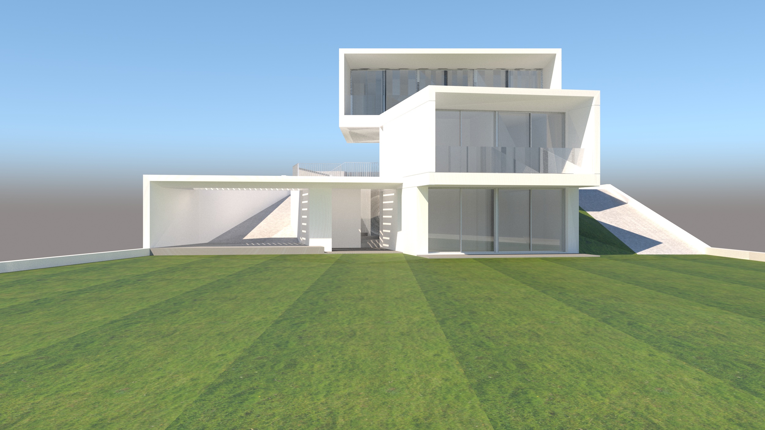 modern minimalist house on a lush green lawn with grasses and trees rendered with crisp white walls and large glass windows stainless steel window frame the sky is vibrant blue with few clouds creating a bright and airy atmosphere sunlight casts soft shadows across the structure emphasizing the clean architectural lines the setting is serene and peaceful with a sense of openness and tranquility