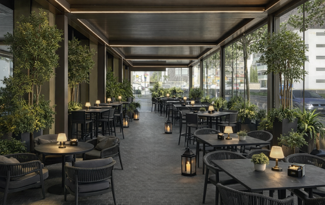 exterior shot adapt the render to the plan remove the floor candelabras place people at the table while they drink a drink