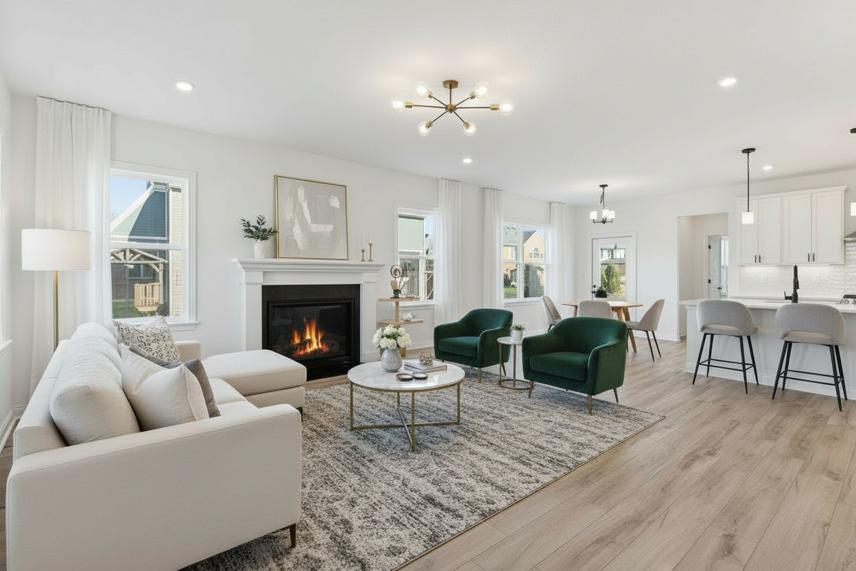 remove the item to the right of fireplace change the great room ceiling light to a black farmhouse style