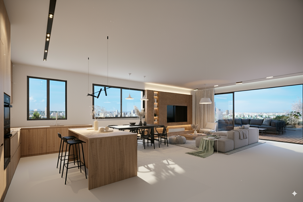 interior rendering view living room and kitchen of a penthouse apartment located in israel in the dan metropolitan area in an urban but not dense area with a green view from the windows and the balcony it is a family home designed in a pleasant warm scandinavian style the skies are blue but not too much the colors in the apartment are soft but not monochromatic there is use of wooden cladding in the kitchen the balcony has a brown wooden deck and lots of plants architecture