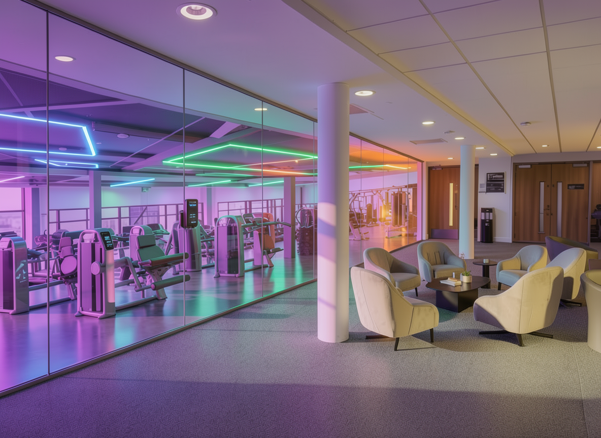 keep the existing composition furniture flooring lighting and glass unchanged change all structural columns and the ceiling to black matte or slightly satin finish preserving their shape and texture ensure the new black surfaces integrate naturally with the ambient and gym lighting reflecting subtle highlights where appropriate without altering the lounge or gym interiors carpet or materials maintain ultra realistic rendering high detail architectural visualization and modern luxury aesthetic do not add people