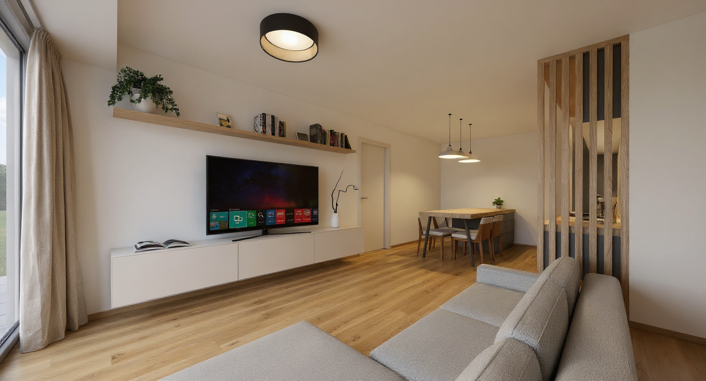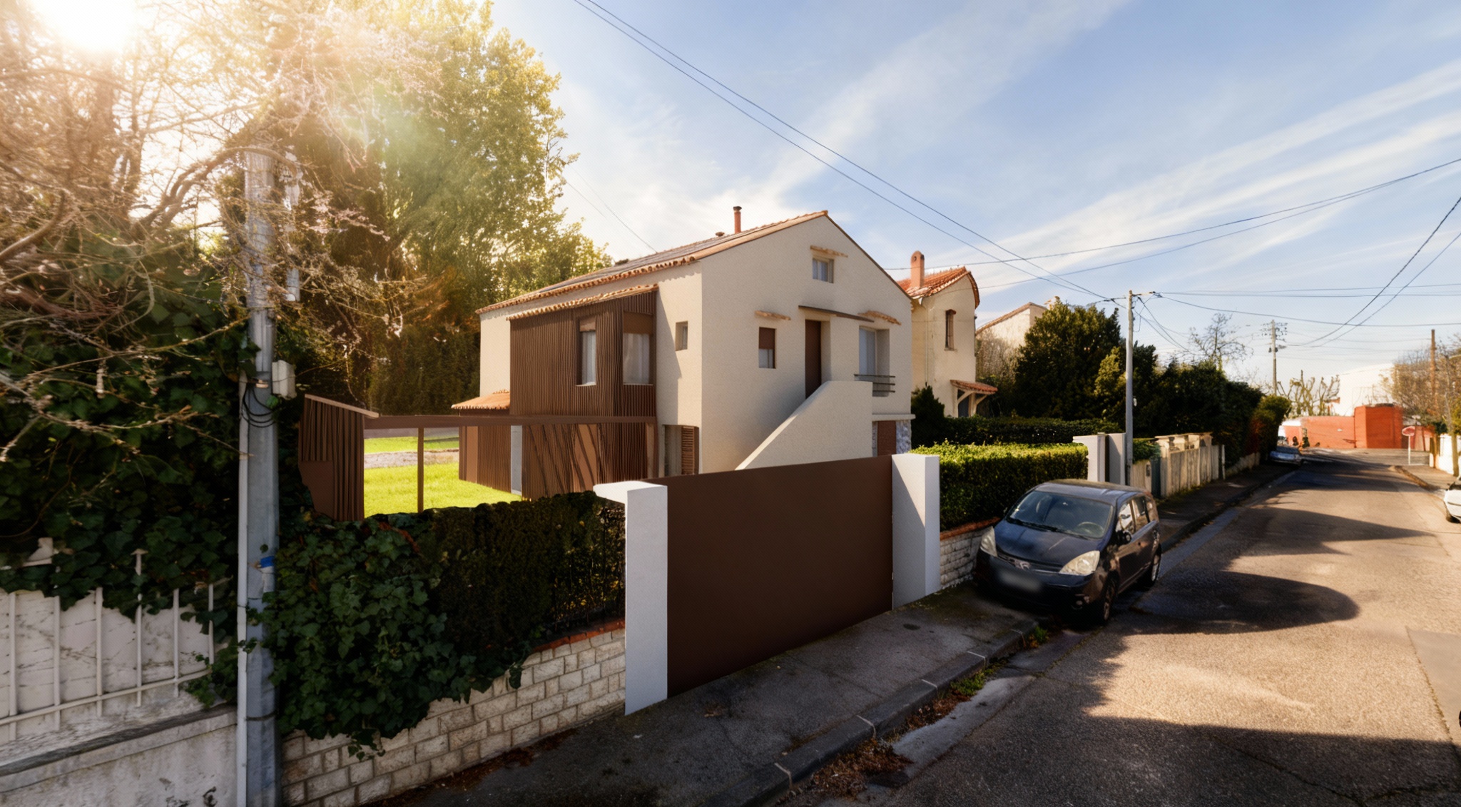 realistic exterior view mineral plaster with olive green shutters white windows and flat tile roofing