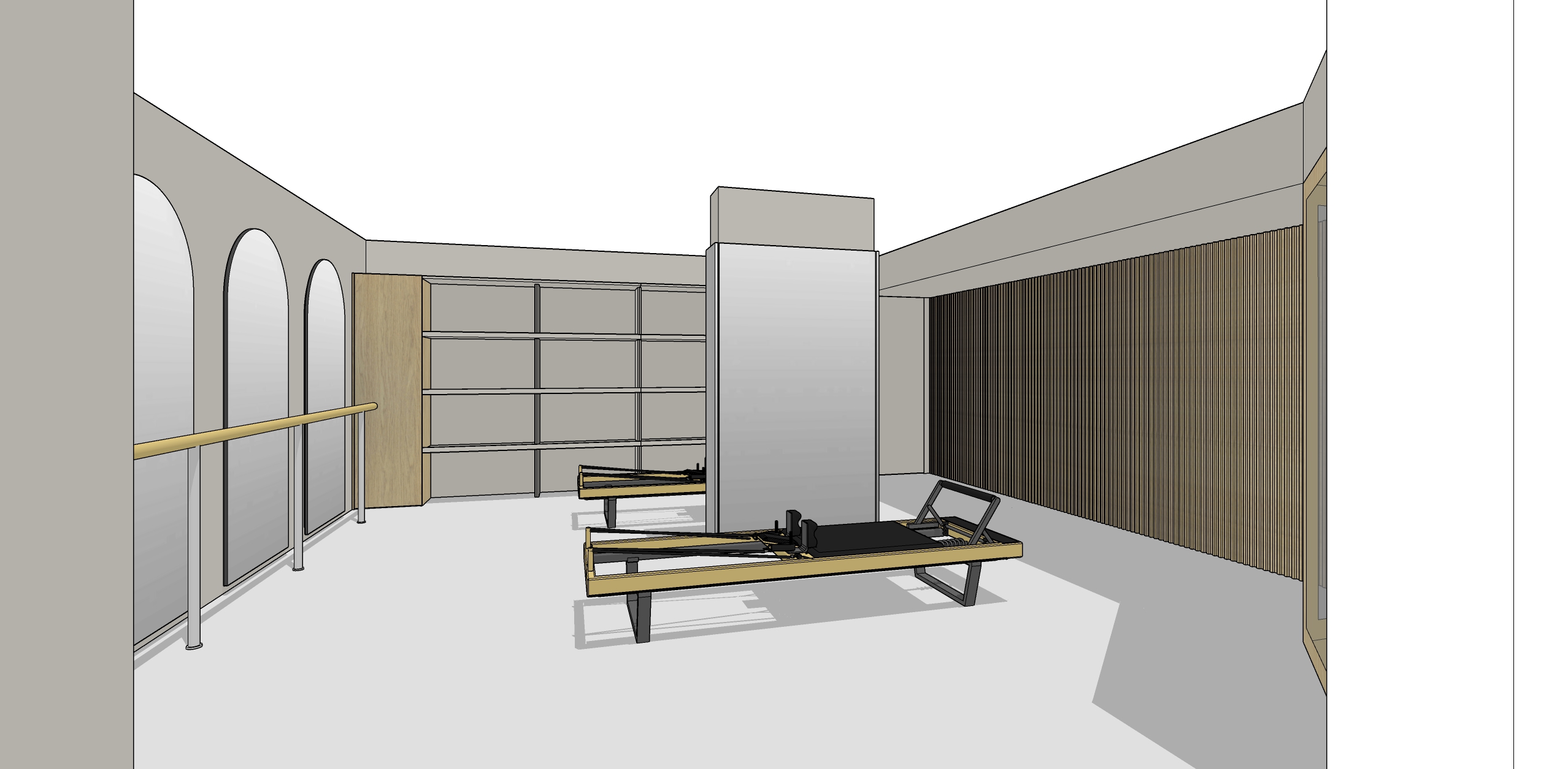 add mirrored cladding only 2 2m high and leave the rest raw as shown add women stretching and also using the pilates machine make the floowing a single colour vinyl grey looking terazzo micro pattern