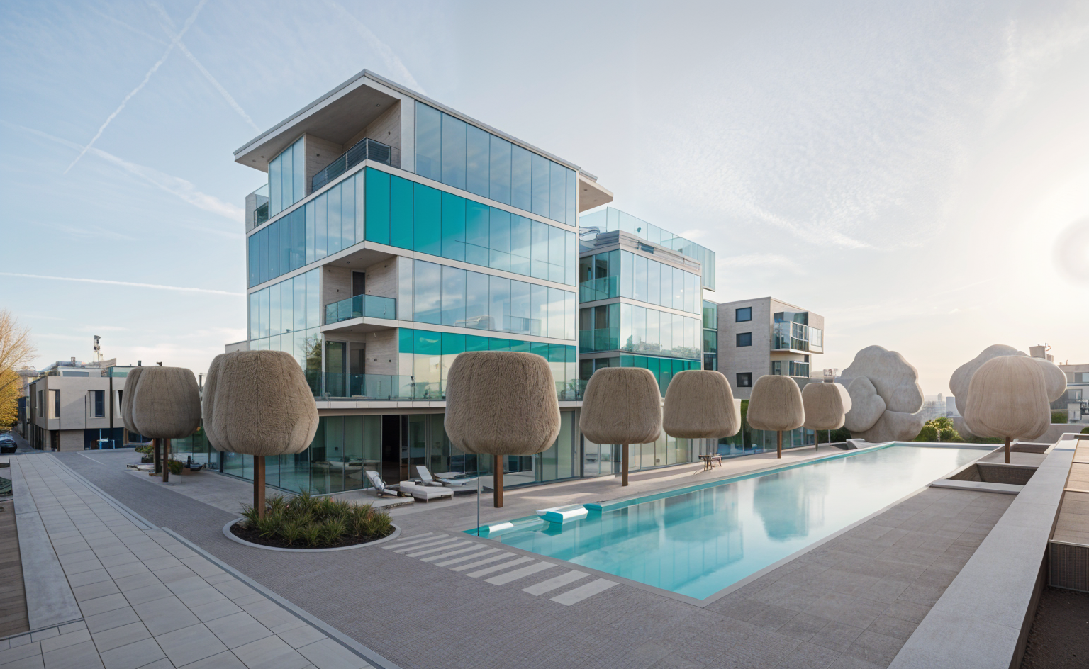 contemporary exterior shot white beach house on canal with waterfall edge pool sunset sky architecture