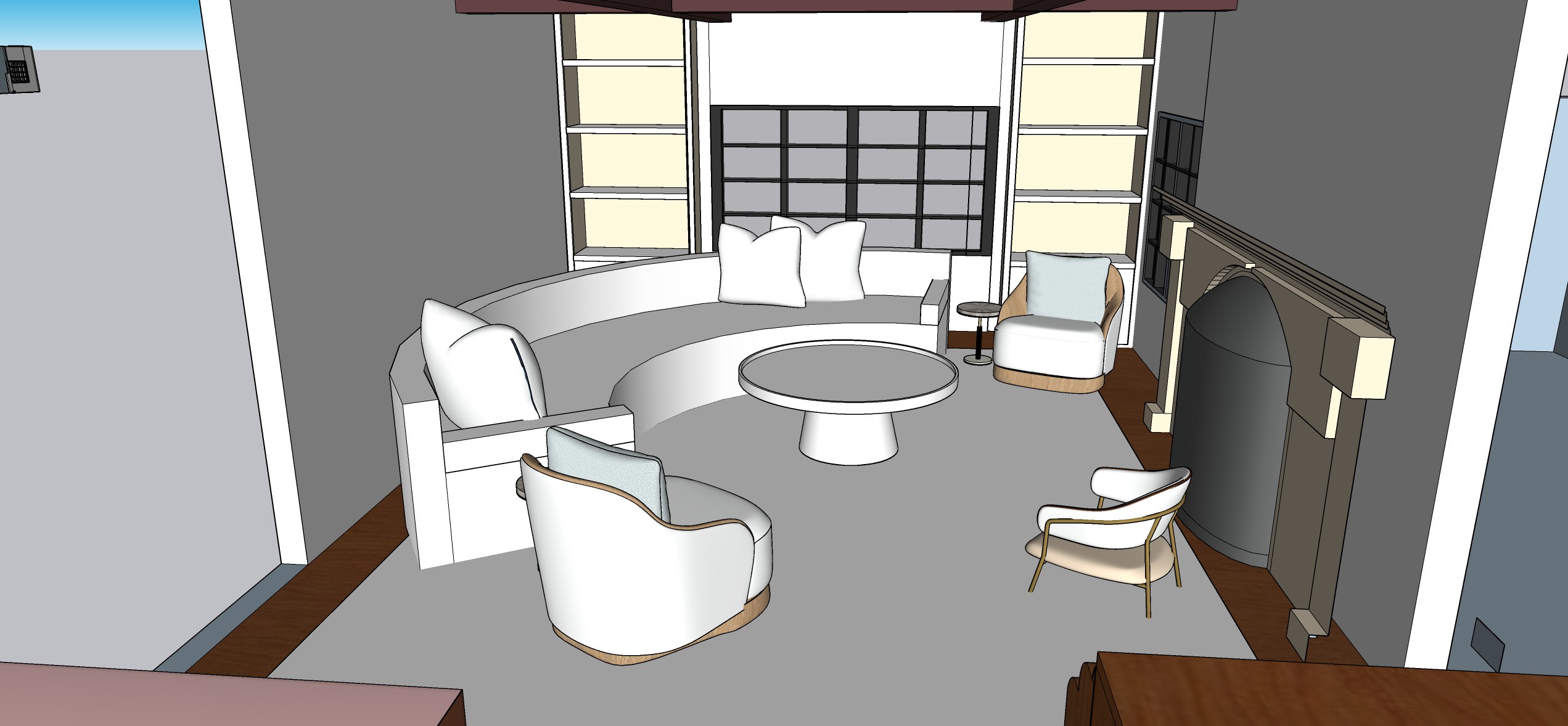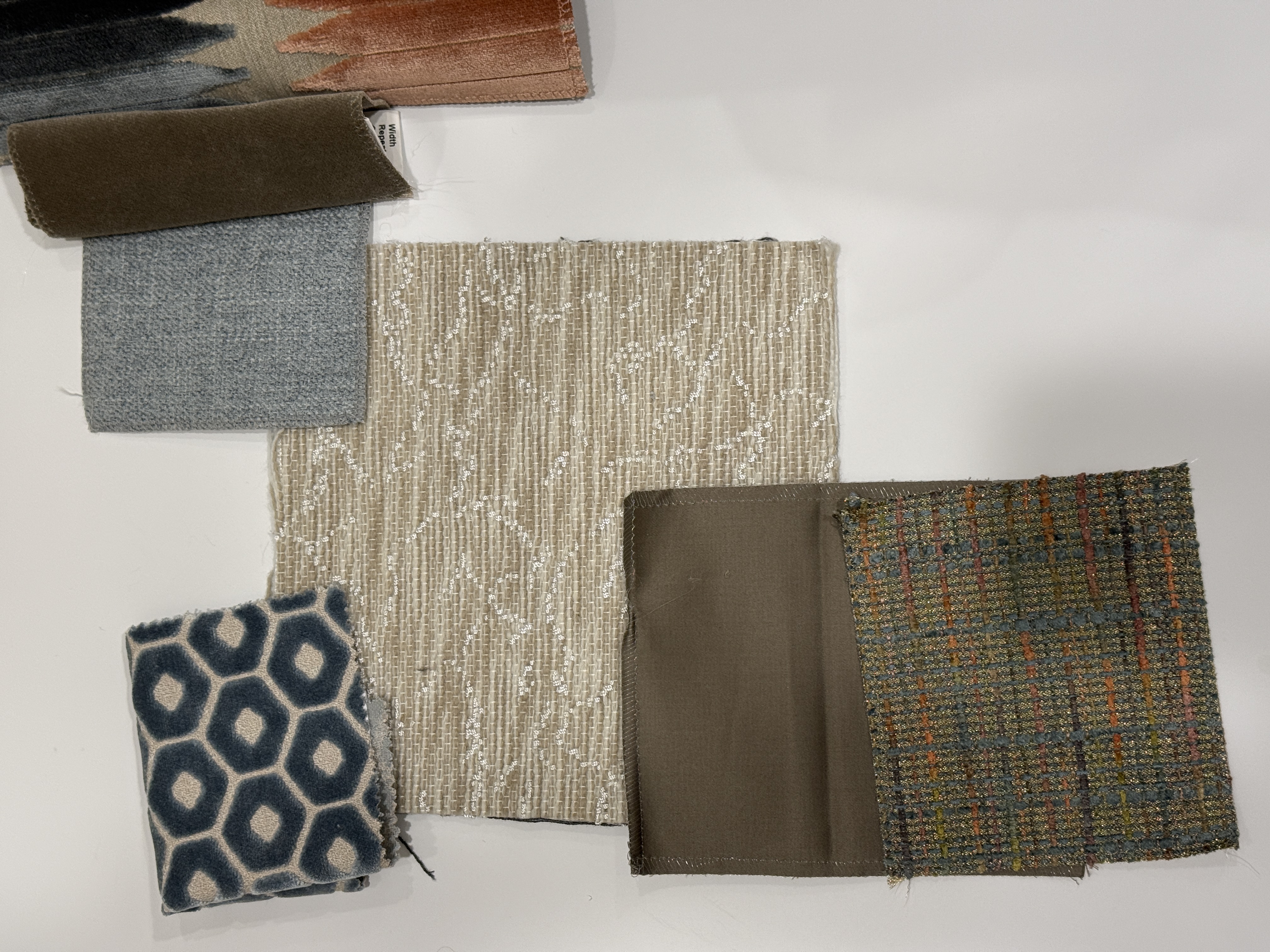 interior shot the sofa is the light blue and the swivel chairs are the brown inside and the brown plaid fabric on the outside the carpet is light