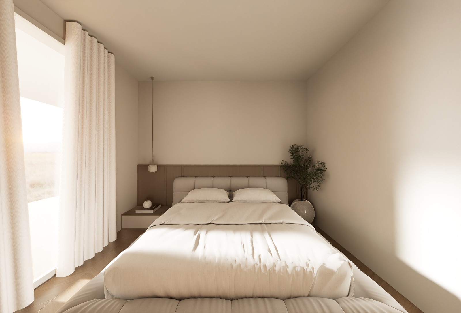keep the exact same bedroom design layout bed position headboard proportions bedside table pendant light placement curtain position wall proportions camera angle and overall composition do not redesign anything and do not move any elements enhance this into a high end ultra realistic render with refined materials and soft luxury atmosphere headboard and wall panel behind bed warm taupe wood soft oak veneer matte finish subtle elegant grain bed upholstery soft warm beige fabric textured premium slightly padded look bed sheets duvet and pillows modern clean realistic fabric soft ivory warm white tones with natural folds and slight imperfections not flat not perfect curtains light warm white fabric soft slightly translucent realistic folds walls soft warm off white beige smooth matte finish floor natural oak herringbone warm tone matte realistic grain add subtle styling realism soft shadows natural light coming from the left gentle sunlight glow keep the atmosphere minimal calm luxury and warm like a high end interior photoshoot improve lighting material realism and texture depth without changing the design important do not change furniture design proportions or layout only improve realism materials and styling negative prompt restriction no redesign no extra furniture no color changes outside the palette no camera change no overexposed lighting no glossy materials