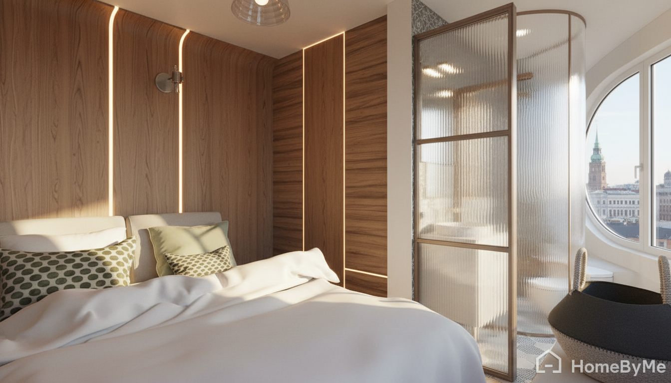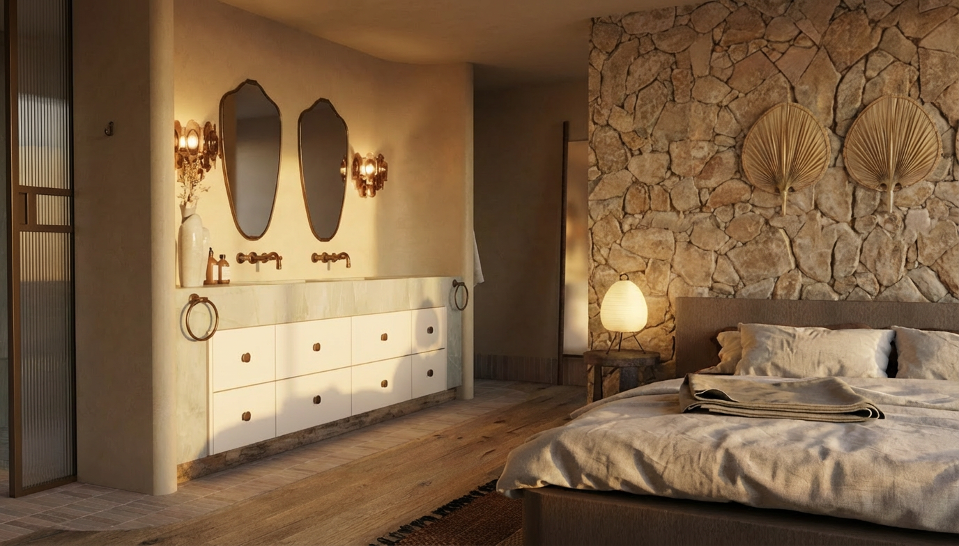 the wall sconces are soft brown toned murano glass the vanity cabinetry is white polyurethane which a reclaimed timber kickboard golden hour dusk time of day