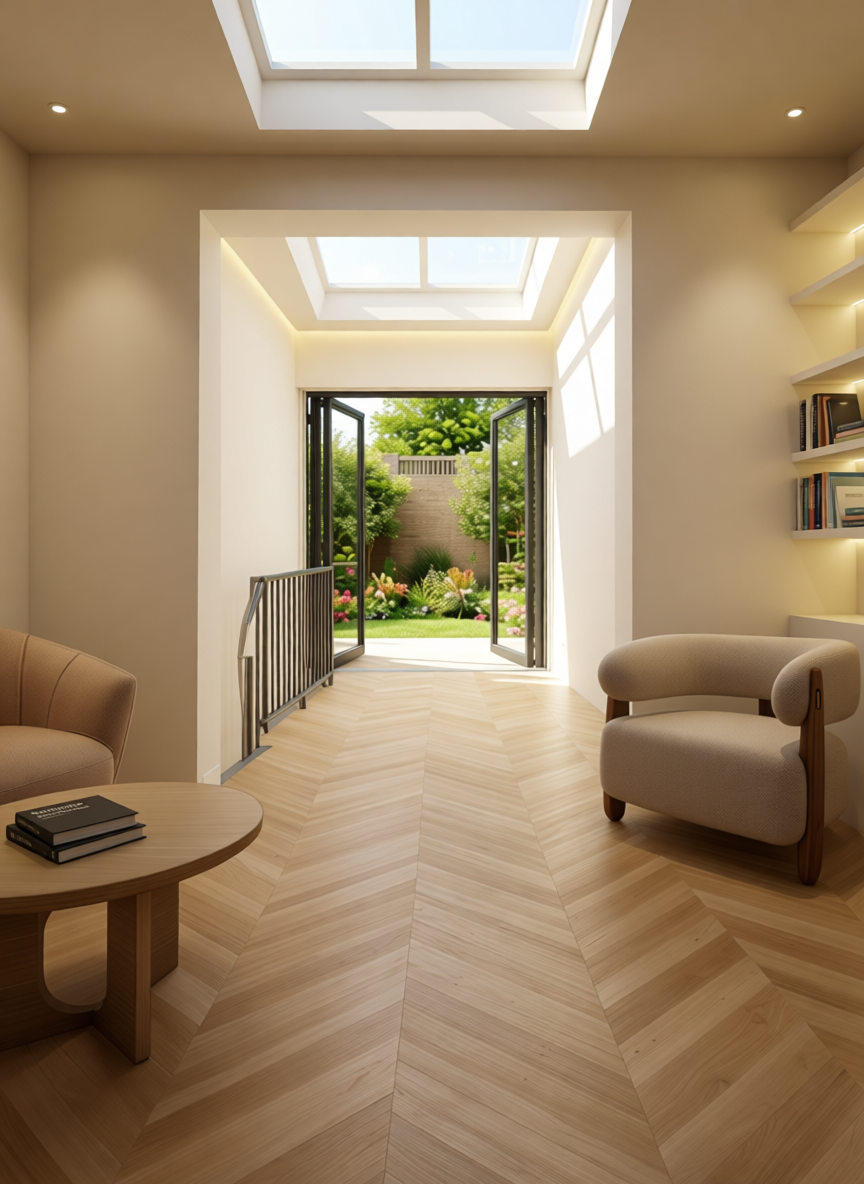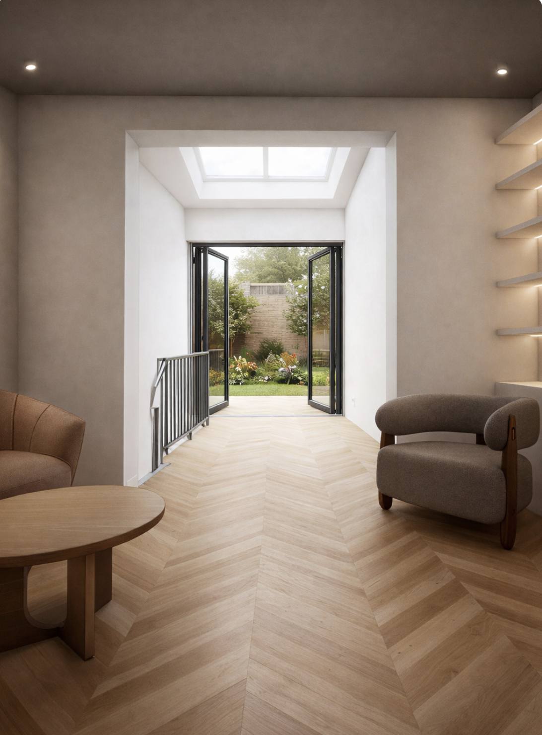 interior room with soft ambient lighting featuring a light beige chevron patterned wooden floor a comfortable beige armchair and a round wooden coffee table the walls are painted in a warm off white with gentle recessed lighting illuminating built in shelves a large skylight above casts natural light enhancing the tranquil atmosphere bi fold doors open to a lush garden with vibrant green leaves and flowers there are books on the shelves and on the coffee table the balustrade and the doors are white the balustrade has a light oak handrail the overall mood is peaceful and serene with a blend of natural and soft neutral tones