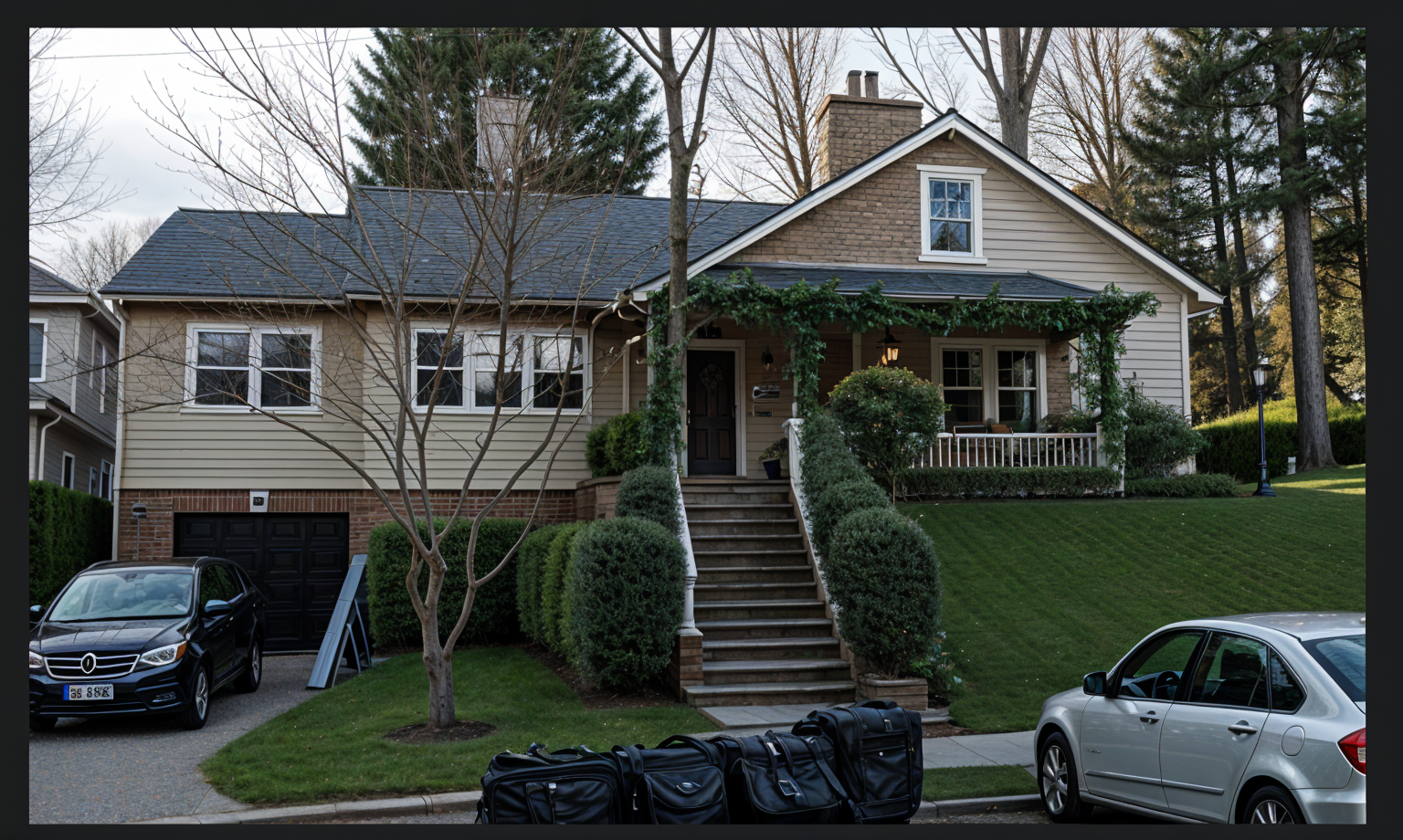 keep house the same only change the color of railing is black and the house is fully in cladding no stone fundation make the stair case full width of the balcony