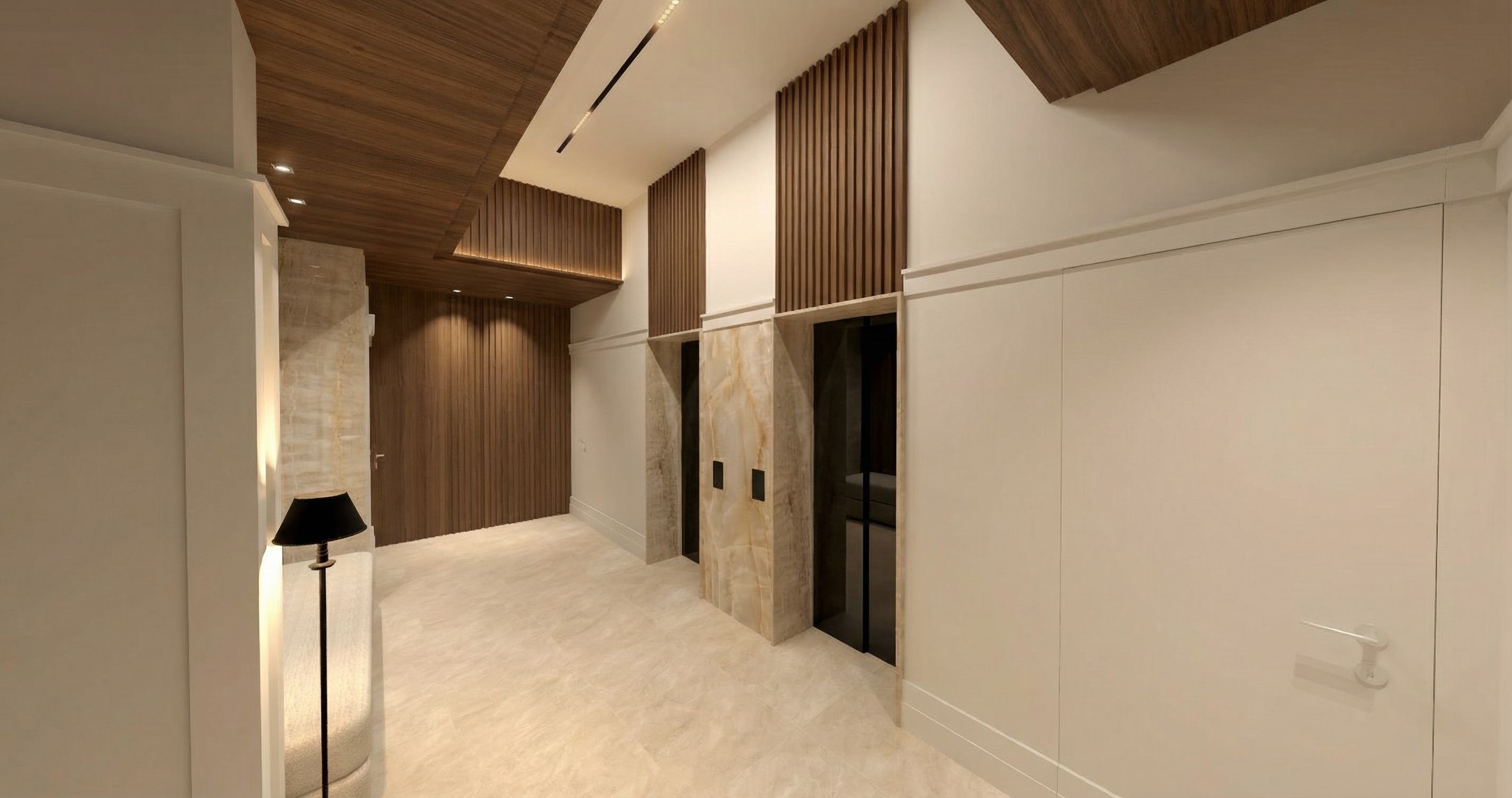 walls white steel cladding roof black steel cladding background in a forest setting put a lake in the background add stairs to mandoor openings
