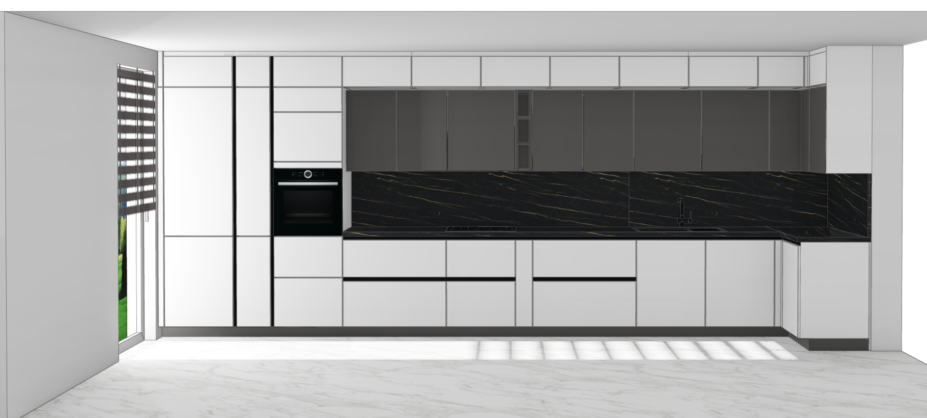 render a modern kitchen scene with a sleek and minimalist design the cabinets are pure white nobilia touch 332 and matt reflecting soft ambient light the top box cabinets are nobilia touch schiefegrau 334 in matt finish the backsplash and countertop feature a luxurious black marble nobilia marmor venato nero 320 with subtle gold veins include an integrated futuristic black oven built into the cabinetry the floor is a pristine white marble with gentle gray veining adding elegance a window on the left lets in natural light with blinds casting soft shadows the atmosphere is clean sophisticated and contemporary with a touch of luxury the sink is blanco etagon silgranit in black color the tapis black blanco linus s