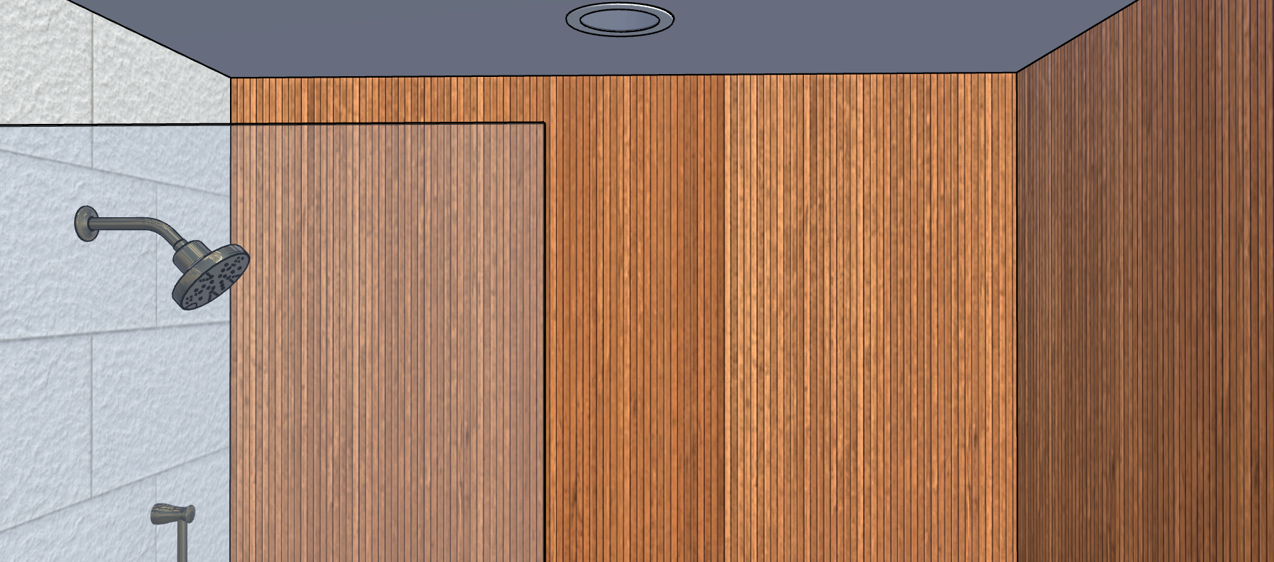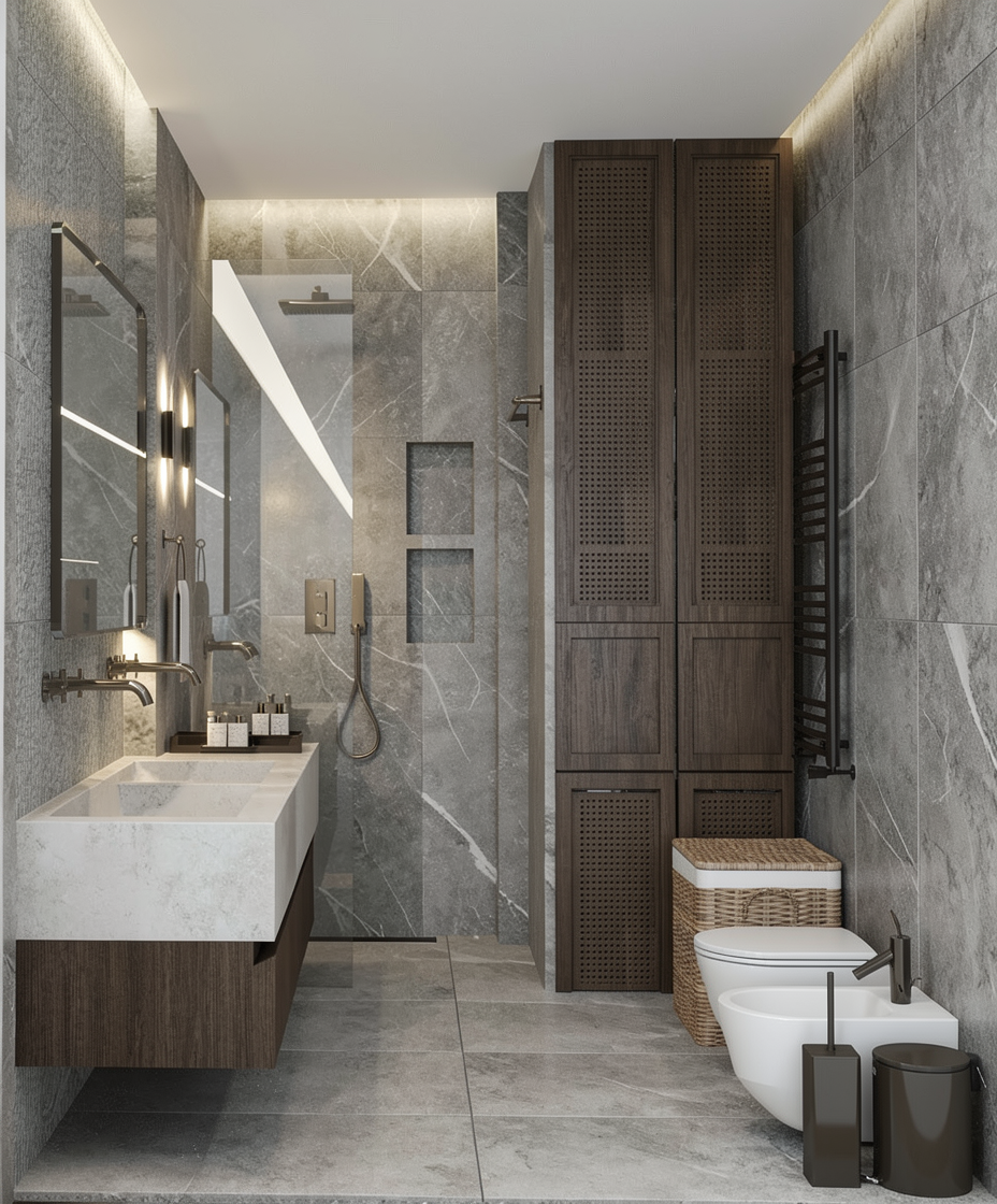 preserve all existing textures geometry materials colors and proportions overall scene is evenly brightened using neutral warm lighting only do not add highlights glow reflections or new light sources lighting comes only from mirror with soft white semi transparent backlit halo warm evenly diffused there is no sunlight nor any light source other than the vanity light and backlit mirror the shower head and all shower fixtures are not light sources and emit no light all metal hardware and accessories are brushed brass the wood tiles are uniform in color with different shades and grains the other tiles are unicolor with 3d horizontal chiseled texture with a color code rgb 234 228 218 walls with no tile on them are painted in a rgb 234 228 218 color the light switches are white