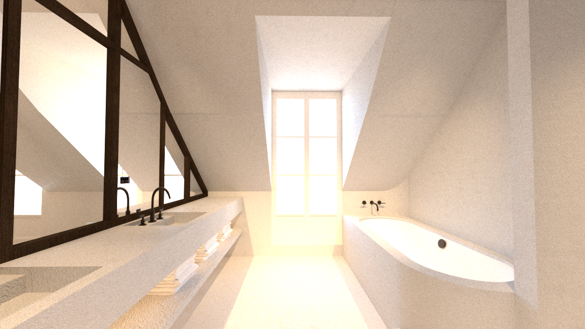 minimalist bathroom interior floor walls and vanity unit in very light beige polished concrete seamless surfaces soft natural light warm and neutral tones refined contemporary architecture clean lines high end materials calm and elegant atmosphere realistic textures subtle shadows architectural photography style ultra realistic render